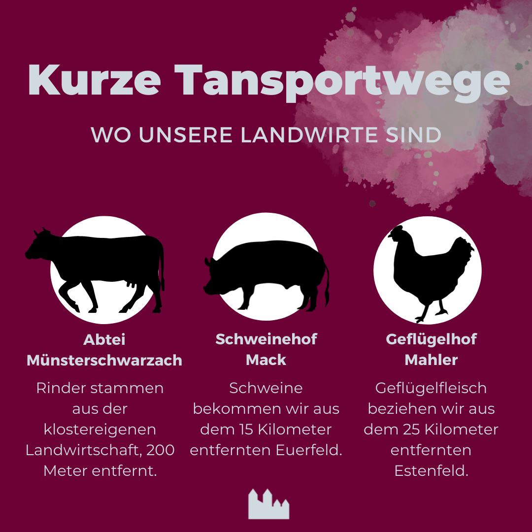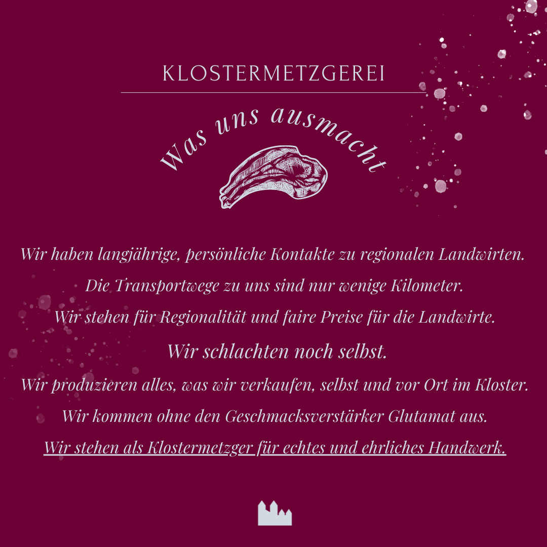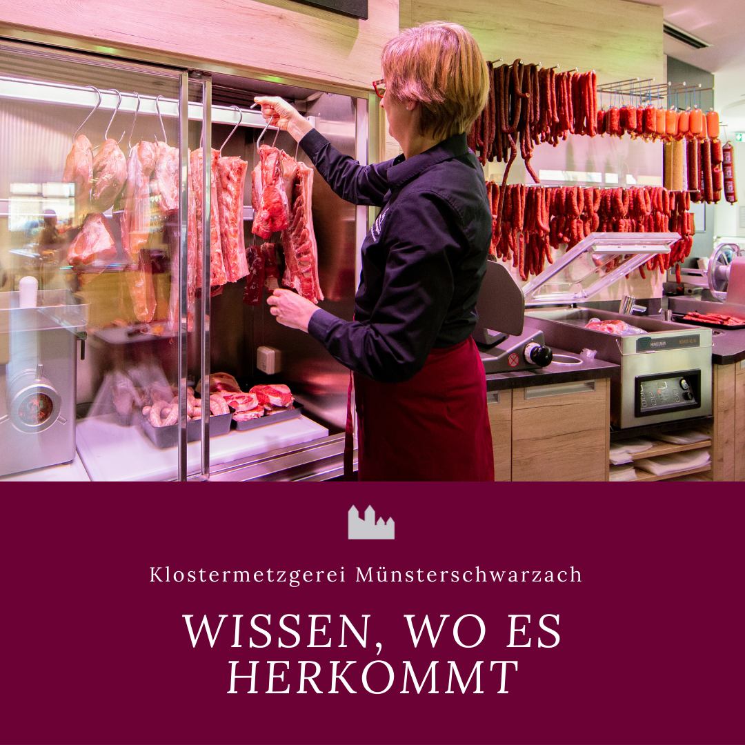 Ähnlich sieht es in der Klostermetzgerei aus. Dort passiert von der Schlachtung bis zur fertigen Wurst alles auf dem Gelände der Abtei Münsterschwarzach. Durch langjährige persönliche Beziehungen zu den Landwirten kann garantiert werden: Kurze Transportwege für die Tiere und faire Preise für die Landwirtschaft.