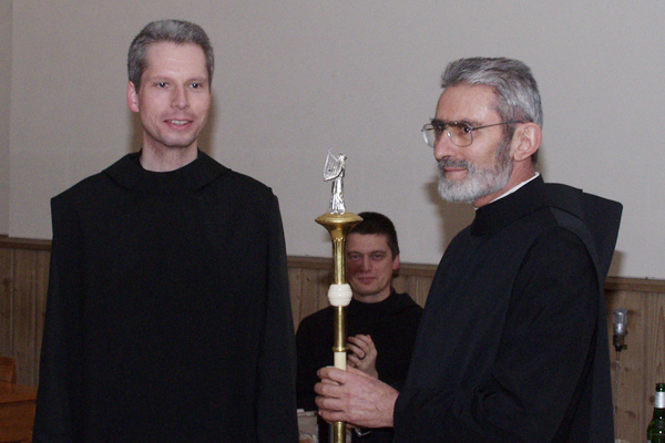In einer kleinen Feier im Refektorium übergab P. Gunther am 25. Februar symbolisch den Cantorenstab an Br. Jeremia-Martin. Abt Michael würdigte in einer Rede die Verdienste von P. Gunther als ersten Cantor, in der er besonders seine Treue im Dienst und seine Liebe zum Choral hervor hob. Zudem wurde der Abend durch verschiedene musikalische Beiträge von Konvent, Schola und P. Dominikus gestaltet.