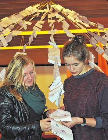 Im Anschluss gab es in den Klassenräumen die Möglichkeit, einen persönlichen Bibelvers zu ziehen. Auf den Blättern war Platz, auf diesen Vers zu antworten und eigene Gedanken hinzuzufügen: fragend, bittend, zweifelnd, dankend, zögernd, zuversichtlich. Die Antwortzettel fädelten die Schüler auf lange Stricke und brachten sie in die Kapelle, wo sie nach oben gezogen wurden und so ein Zelt bilden. Bis zum „Tag der Offenen Tür" des Gymnasiums am 15. März lud dieses Zelt ein, sich darin umzusehen und in den Zwischenräumen die Gegenwart Gottes zu erahnen.