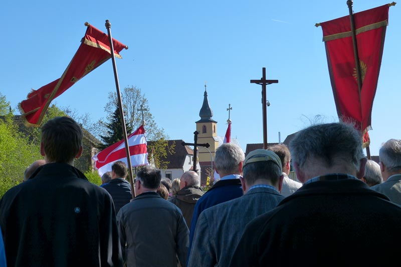 Rund 600 Gläubige sind an Christi Himmelfahrt, 5. Mai, nach Dimbach gekommen, um bei strahlendem Sonnschein gemeinsam mit den Mönchen von Münsterschwarzach vor der Wallfahrtskirche Gottesdienst zu feiern. Zuvor hatten sich rund 30 Benediktiner und viele Wallfahrer aus den Klosterdörfern Dimbach, Nordheim, Sommerach, Gerlachshausen, Düllstadt, Reupelsdorf, Schwarzenau, Hörblach, Stadtschwarzach und Münsterschwarzach zu Fuß in die ehemalige Propstei der Abtei aufgemacht.