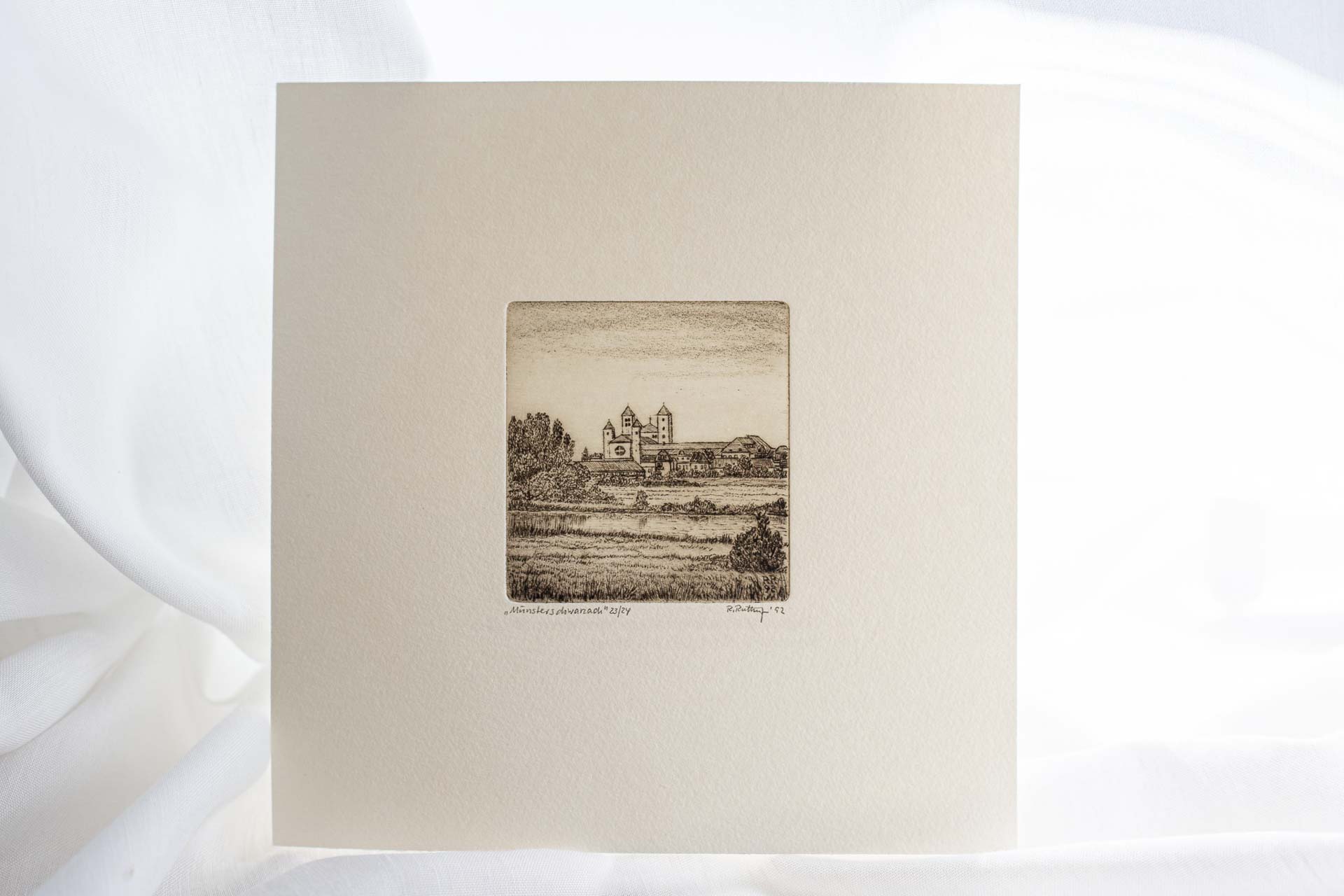 Insgesamt 24 Abzüge hat die verstorbene Künstlerin Rosemarie Rüttinger von der Abteikirche Münsterschwarzach geschaffen. Diese stehen in ebendieser begrenzten Anzahl in der Klosterbuchhandlung "Buch und Kunst im Klosterhof" zum Verkauf. Die Kunstwerke wurden mit der sogenannten Kaltnadeltechnik, ein grafisches Tiefdruckverfahren, hergestellt.