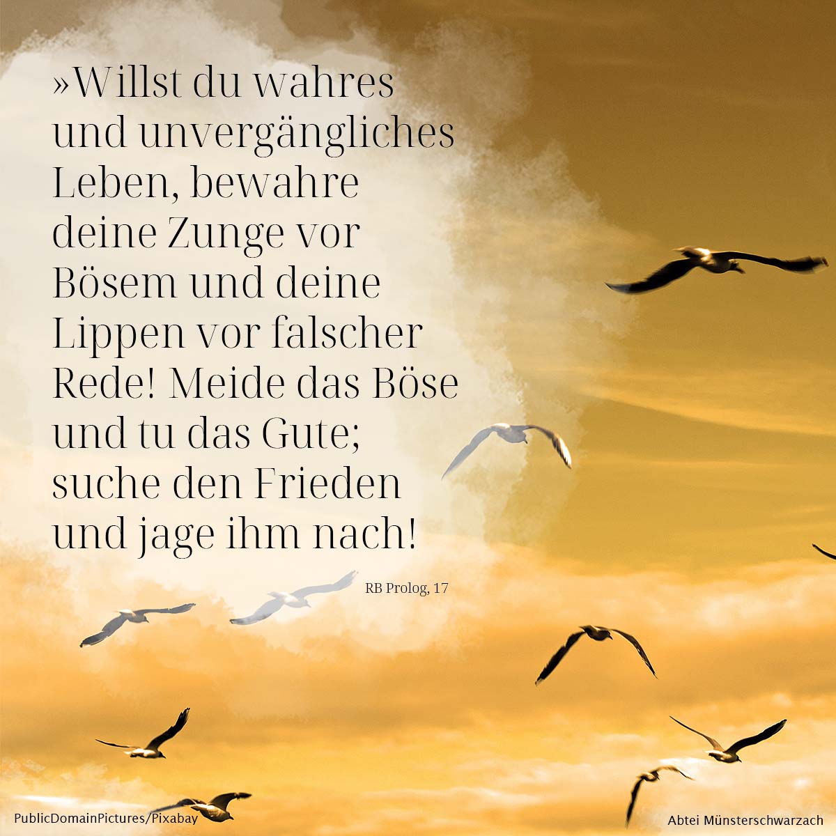 17. »Willst du wahres und unvergängliches Leben, bewahre deine Zunge vor Bösem und deine Lippen vor falscher Rede! Meide das Böse und tu das Gute; suche den Frieden und jage ihm nach!