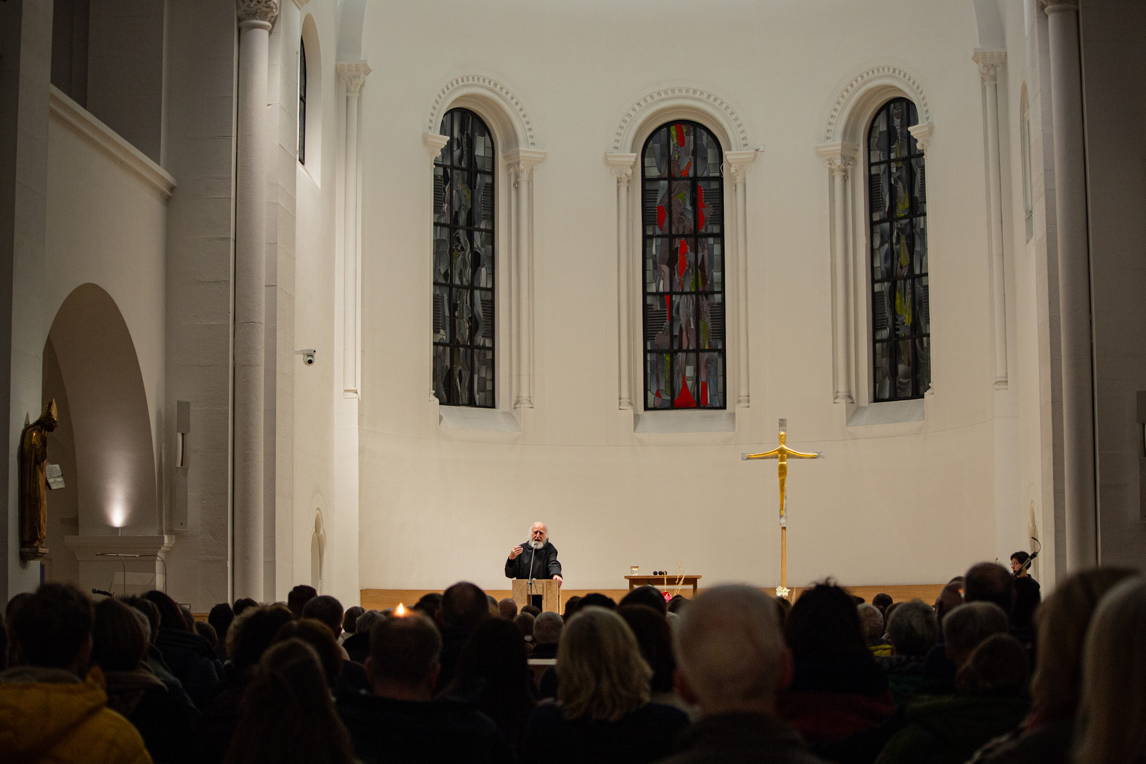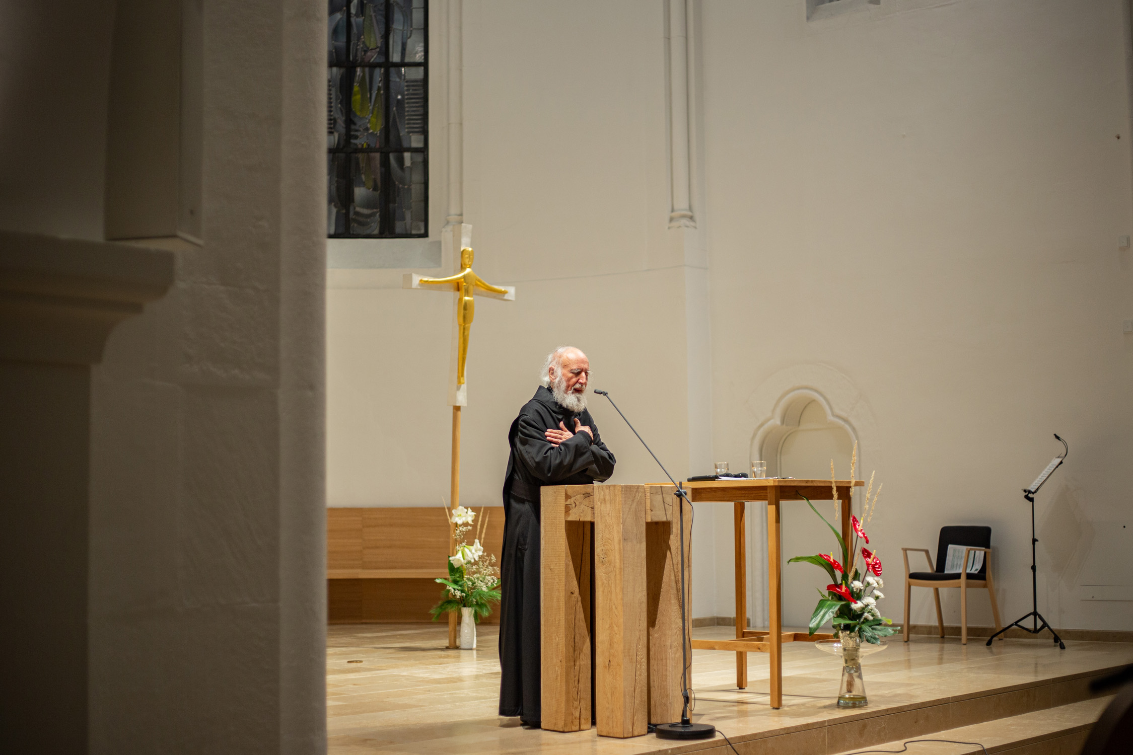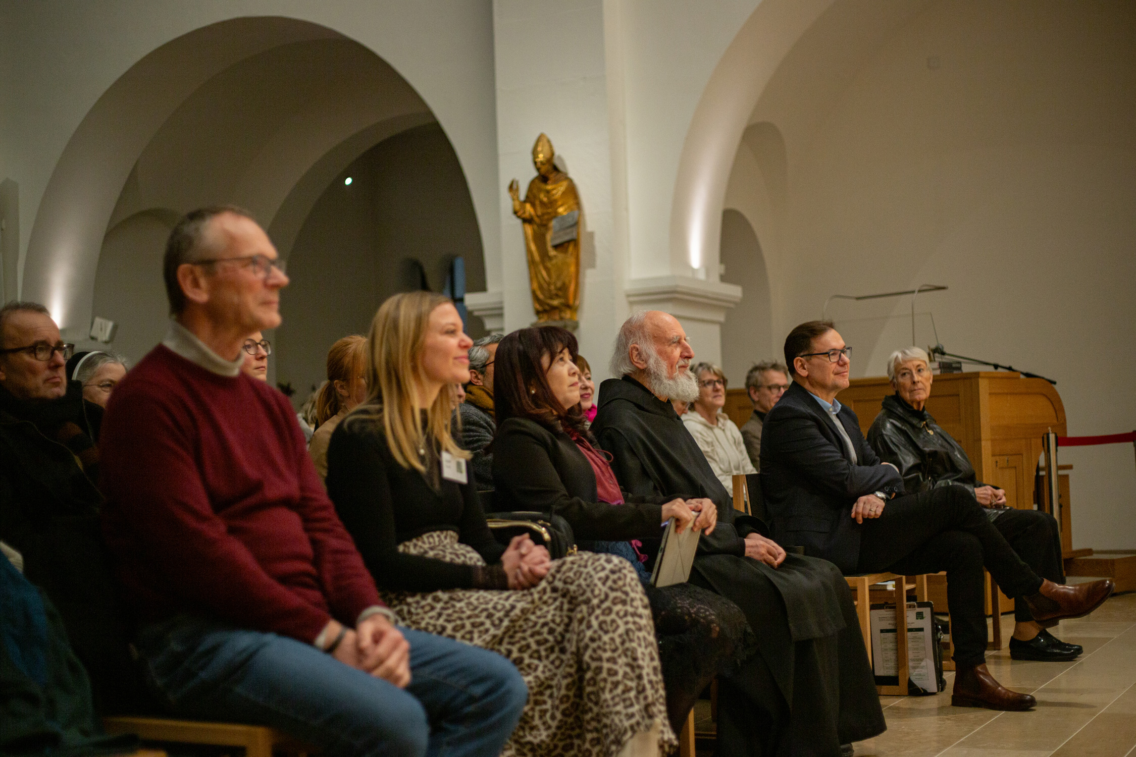 Es hat schon Tradition, dass P. Anselm Grün seine neuen Bücher in der Kirche der Erlöserschwestern in Würzburg präsentiert. Die vom Team Benedikt organisierten Veranstaltungen sind dabei, wie auch am Dienstagabend, immer bis auf den letzten Platz besetzt. Dieses Mal kam mit Co-Autorin Hsin-Ju Wu noch ein besonderer Gast dazu. Unter dem Titel „Wer bin ich? Selbstwerdung statt Selbstoptimierung“ veröffentlichte die Verlagsleiterin aus Taiwan gemeinsam mit P. Anselm bereits das 4. Buch im klostereigenen Vier-Türme-Verlag. Musikalisch wurde der Vortrag von Almut Frenzel-Riehl gestaltet.