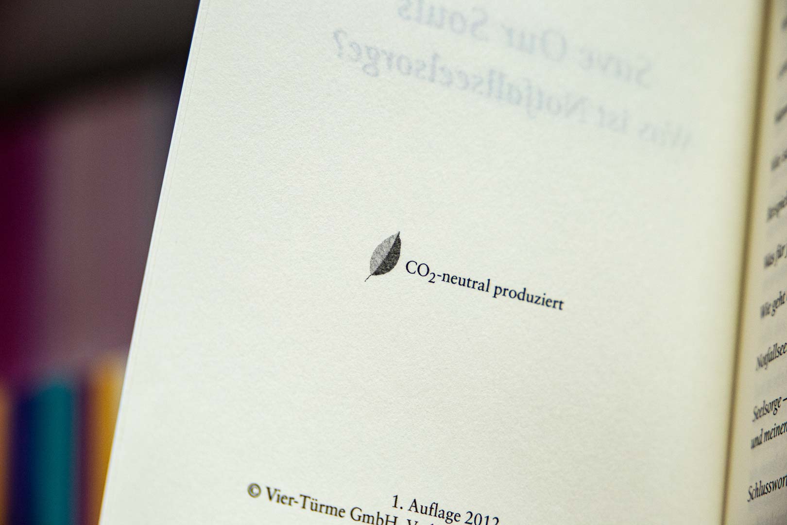 Als Verlag der Mönche von Münsterschwarzach sieht sich der Vier-Türme-Verlag den Umweltzielen der Abtei Münsterschwarzach besonders verpflichtet. Seit Jahren werden die Bücher in einer Partnerdruckerei CO2-neutral gedruckt. Im Jahr 2019 wurde die Plastikverpackung für Neuerscheinungen abgeschafft. Alle neuen Bücher tragen daher das Siegel "Ohne Folie".
