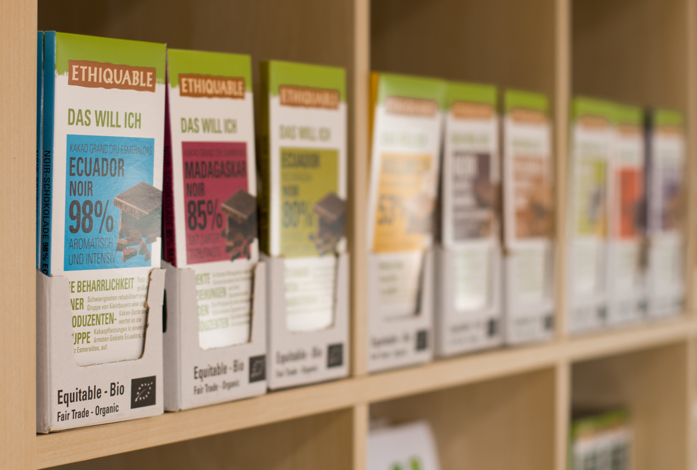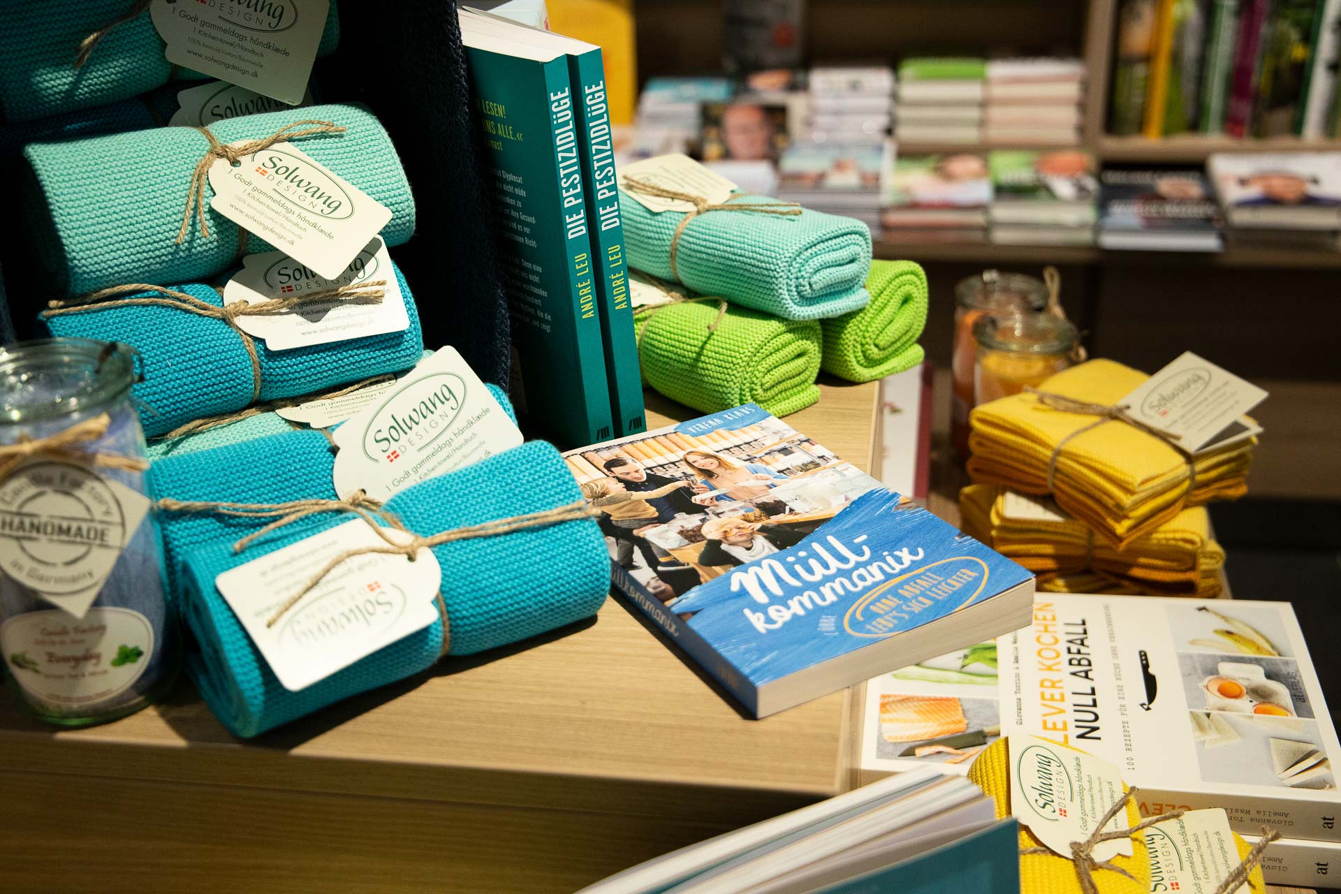 Besondere Büchertische zur Nachhaltigkeit werden ergänzt durch entsprechende Produkte zur Thematik. Auch gibt es in der Buchhandlung keine Plastiktüten. Wenn Kundinnen und Kunden eine Tüte möchten, empfehlen sie gerne die „Kipepeo“-Beutel weiter. Auch die eigenen Taschen in moderner Turnbeutelform sind nicht aus Plastik, sondern aus fairer Bio-Baumwolle.