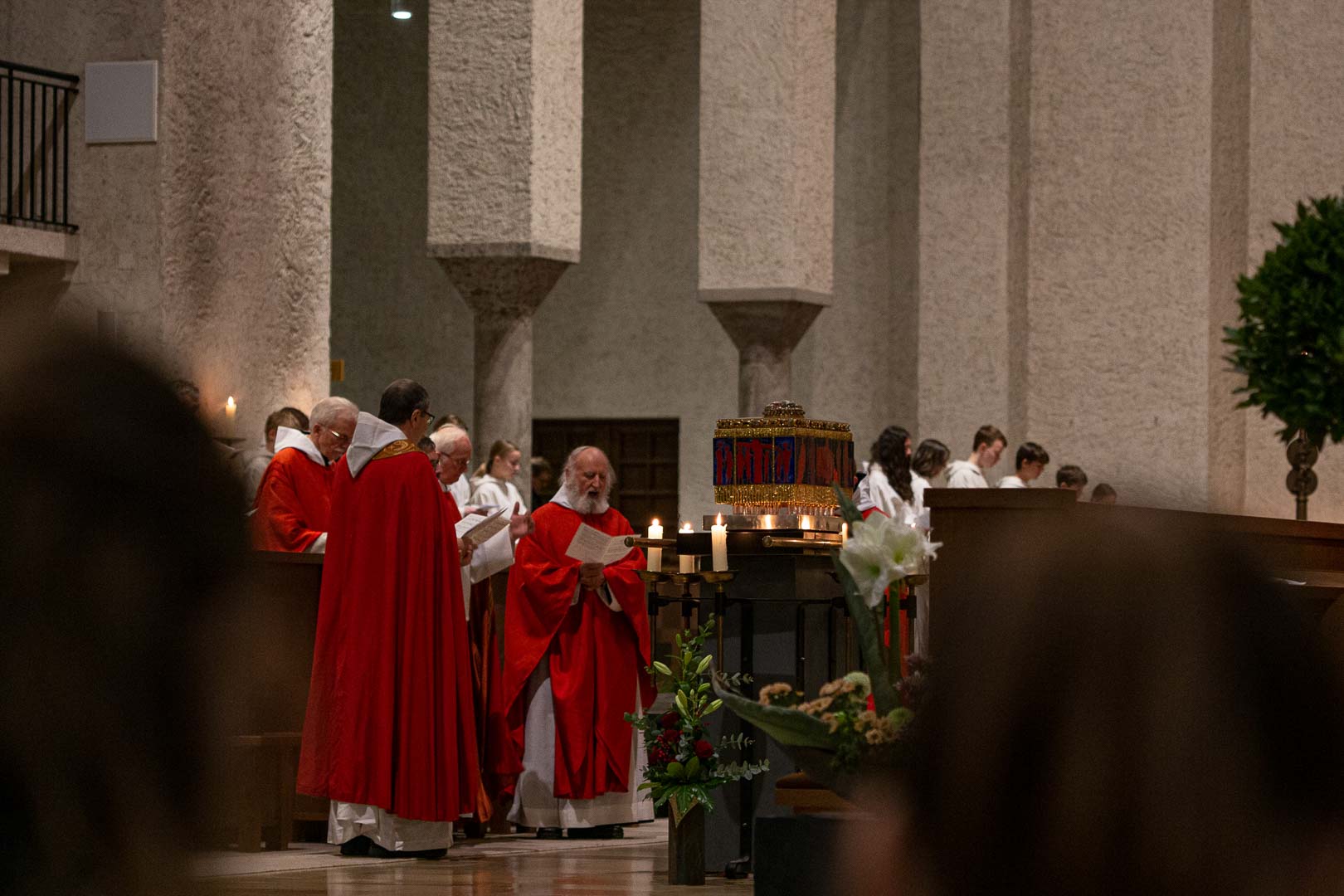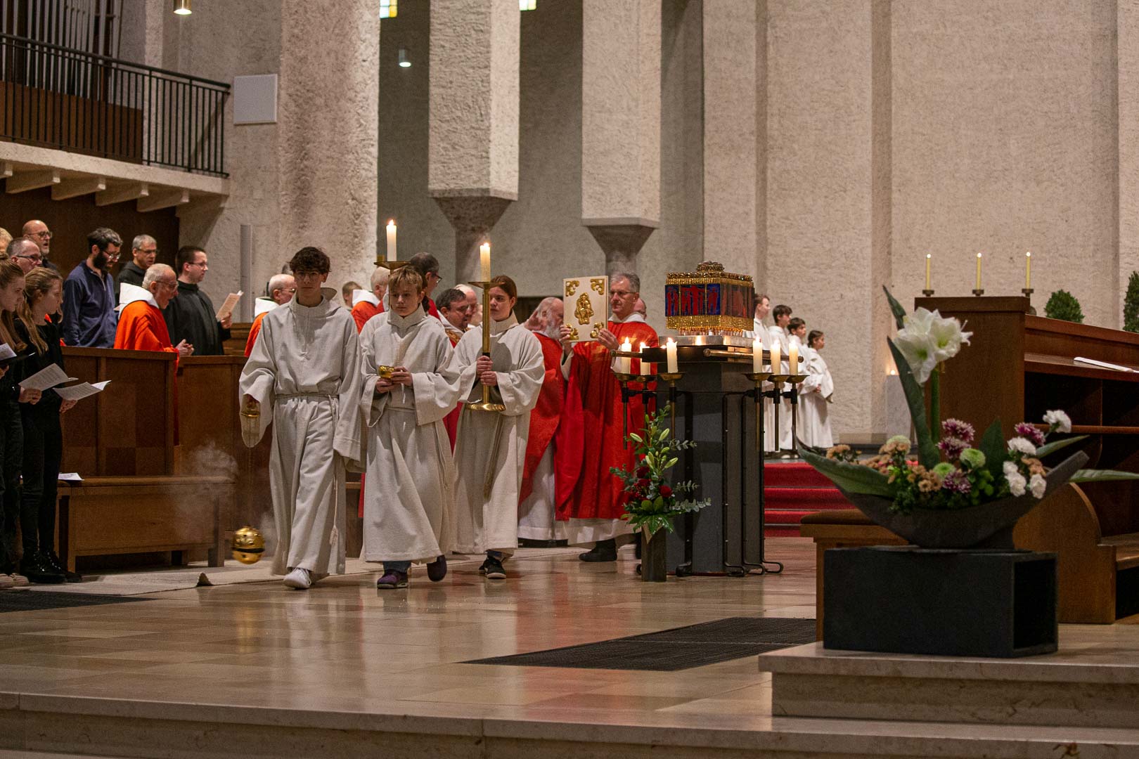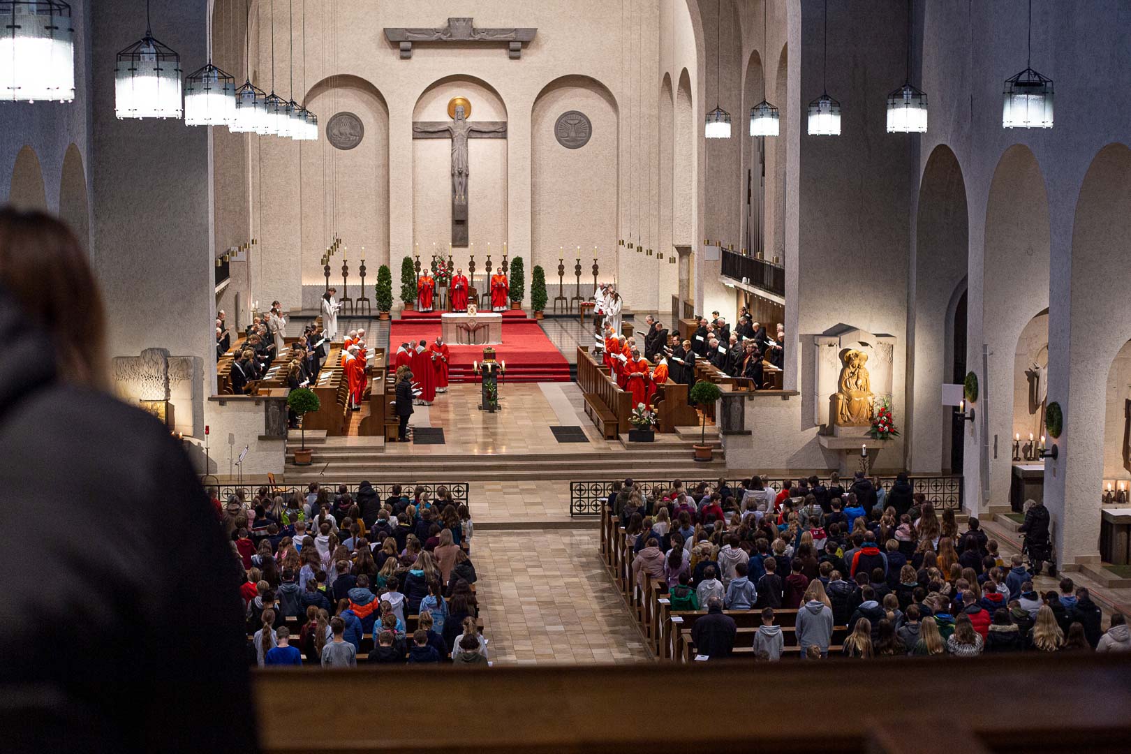 Gemeinsam mit der gesamten Schulfamilie des Egbert-Gymnasiums haben die Mönche der Abtei Münsterschwarzach zum Gedenktag der Klosterpatronin Felizitas nach zweijähriger Pause wieder ein Pontifikalamt feiern können. Den Reliquienschrein, der normalerweise in der Krypta seinen festen Platz hat, trugen Schüler in einer feierlichen Prozession in den Chorraum. „Es ist uns Mönchen wirklich eine Freude, mit euch wieder gemeinsam Felizitas zu begehen“, sagte Abt Michael Reepen OSB in seiner Begrüßung. Traditionell bekommen an diesem Tag die 5. Klassen ihre Klassenpaten aus dem Mönchskonvent: Br. Remigius (5a), P. Maximilian (5b). Br. Alois Maria (5c) und P. Cornelius (5d) werden in den folgenden Schuljahren ihre Klassen begleiten.