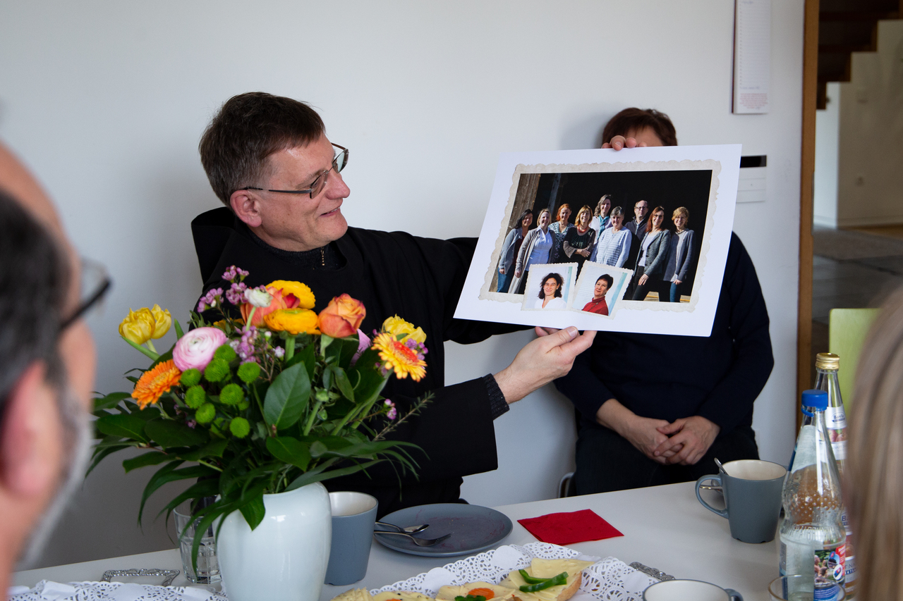 Vom Team des Vier-Türme-Verlags gab es zum Abschied ein Foto mit allen Mitarbeiterinnen und Mitarbeitern. Das werde einen besonderen Platz erhalten, versprach Br. Linus.