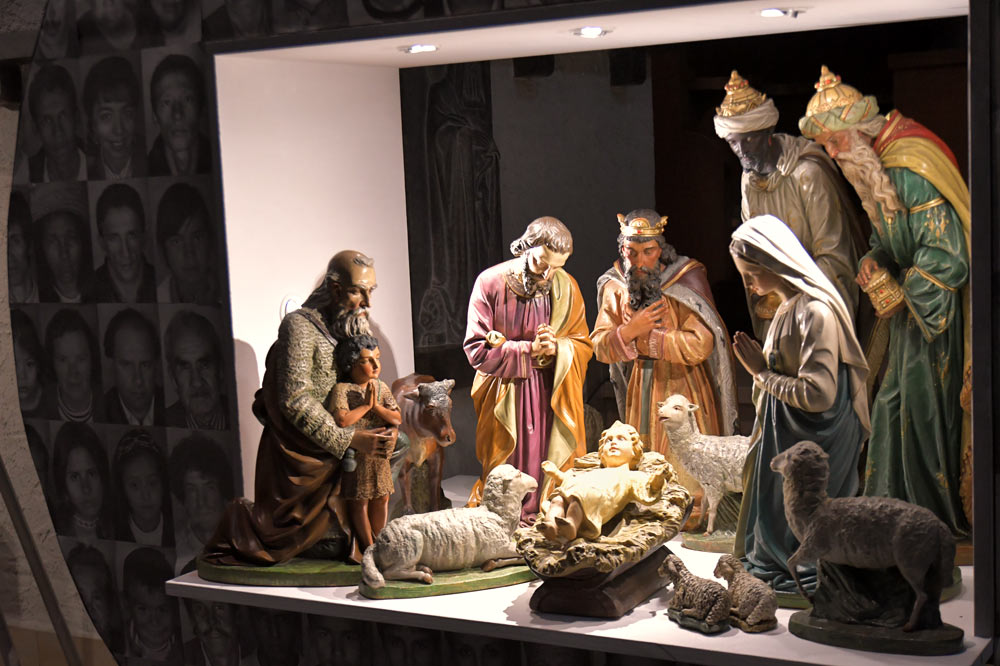 Alte, Junge, Männer, Frauen, Kinder. Über 100 Augenpaare rund um die Krippe nehmen ihrerseits den Betrachter in den Blick. Pater Meinrad rät, diesen Blick auszuhalten, ihn aufzunehmen, „denn das Christusgesicht begegnet uns in jedem Menschen.“ Nur ein Mann sieht nach unten, er ist genau in der Mitte platziert. Sein Blick fällt unvermindert auf das Jesuskind.