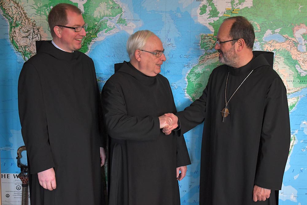 Berlin, Münsterschwarzach, Schuyler (USA), Ndanda (Tansania), Rom, Würzburg und wieder Münsterschwarzach –allein die Stationen auf dem Lebensweg von Bruder Boniface Hampel OSB lassen erahnen, wie vielfältig die Erfahrungen in den bald 80 Jahren seines Lebens und Wirkens waren. Am 1. Februar schloss er nun ein weiteres Kapitel: Bruder Boniface legte seine Aufgaben in der Missionsprokura, die Betreuung der Spender aus England und Irland, in jüngere Hände. Abt Michael Reepen OSB und Missionsprokurator Pater Noach Heckel OSB ließen es sich nicht nehmen, Bruder Boniface mit einem von den Mitarbeiterinnen der Prokura liebevoll gestalteten „American Breakfast“ Feier zu verabschieden.