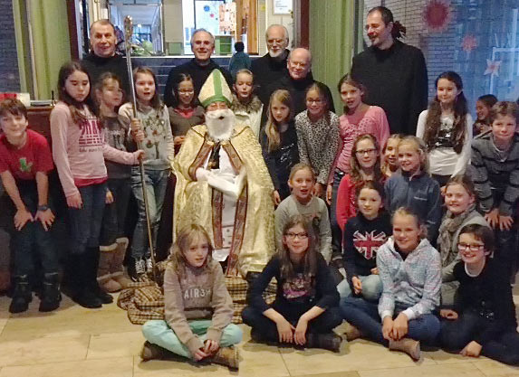 Es hat eine lange Tradition, dass im Tagesheim des Egbert-Gymnasiums der Nikolaus kommt, diesmal in Gestalt von Pater Franziskus Büll OSB, was die rund 100 Schülerinnen und Schüler der 5. Jahrgangsstufe bald bemerkten. Sehr schön war auch, dass die Patenmönche der vier Klassen, Pater Benedikt OSB, Bruder Titus OSB, Bruder Raphael OSB und Bruder Ewald OSB dabei waren.
