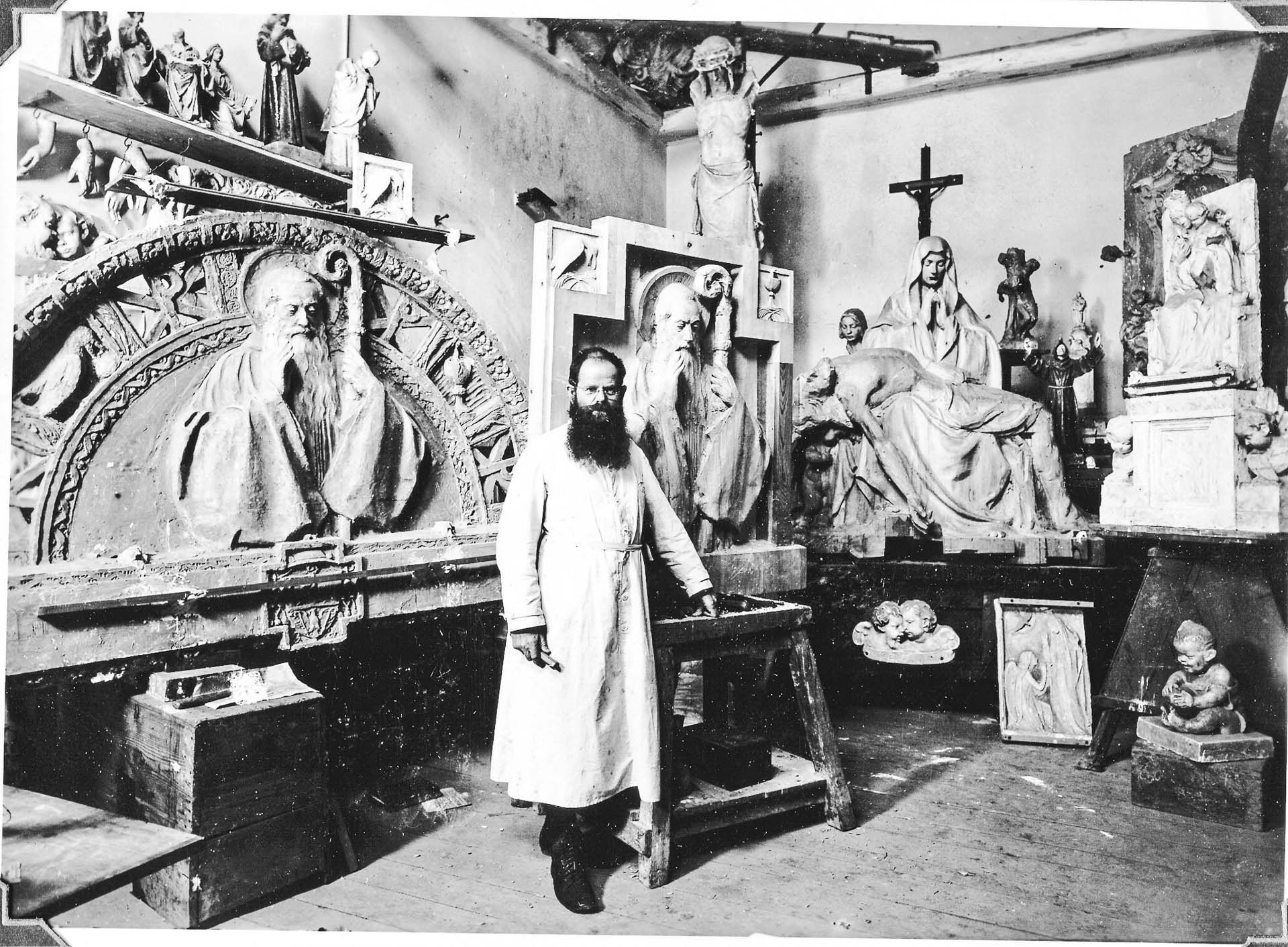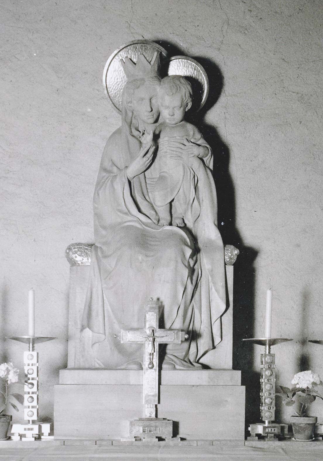 Die Holzfigur für die damalige Notkirche der Abtei war zu Anfang weiß lasiert. Am Pfingstsamstag wurde sie feierlich zum mittäglichen Angelusläuten vor der Werkstätte geweiht und von acht Brüdern in einer Prozession in die Kirche getragen.