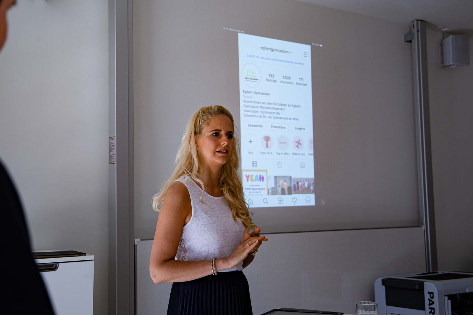 Lehrerin Kerstin Höppner stellte die Social-Media-Aktivitäten des EGM vor. Das Ziel: Mit Schülerinnen und Schülern in Kontakt zu bleiben. Mittlerweile habe die Schule über 1.000 Follower auf Instagram. Höppner erläuterte, dass Social Media den Schülerinnen und Schülern vor allem Spaß machen muss. Auf dem seit November 2019 existierenden Account versuche sie das etwa durch Umfragen in Stories. Während des Corona-Lockdowns sie ihr außerdem wichtig gewesen, Gesicht zu zeigen – mit Fotos aus dem Lehrer-Homeoffice. Besonders gelobt wurde im Vorfeld ein Fitness-Video eines Sportlehrers, das von Höppner und Barbara Becker direkt getestet wurde.