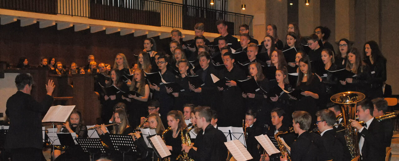 Verschiedene Ensembles der Schule waren mit geistlichen Stücken vertreten, so das Blechbläser-Ensemble, die Chöre der Unter-, Mittel- und Oberstufe, das Gitarrenensemble, das Streichorchester und die Schulblasmusik, das Symphonische Blasorchester und der Kammerchor der 11. Jahrgangsstufe. Darüber hinaus traten eine Reihe von Solisten in Erscheinung, etwa Rebecca und Laura Suta mit der Klavierbegleitung von Linda Graf und viele mehr. Schulleiter Robert Scheller lobte die dargebrachten Leistungen und zeigte sich beeindruckt von dem dahinter stehenden Fleiß und Übungswillen. Sowohl die Musiklehrer Rupert Neugebauer, Br. Julian Glienke und Mechthild Binzenhöfer als auch die Lehrkräfte der Instrumentalschule hatten die Einstudierung der Stücke übernommen.