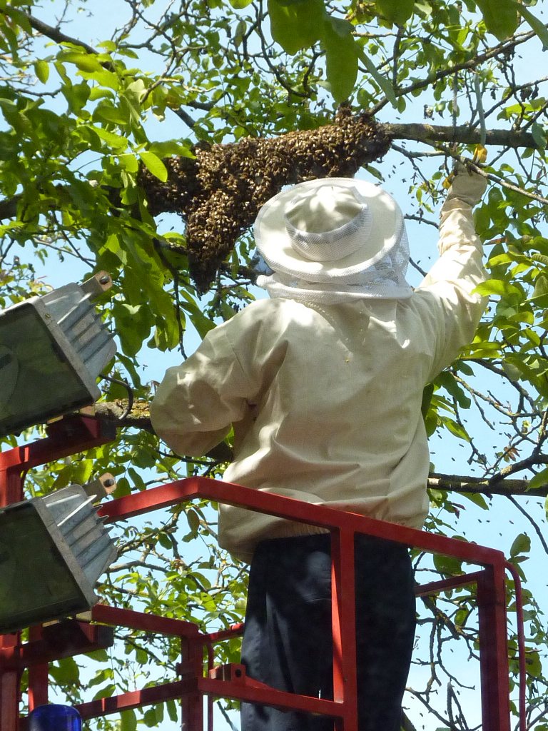 Im Kloster finden sich viele Talente. Das stellte sich unter Beweis als ein ganzes Bienenvolk sich auf der Suche nach einer neuen Bleibe in der Abtei niederließ. Im Gästehaus war schon alles belegt, also siedelten sich die Bienen auf einem Baum vor der Verwaltung an. Dies konnte natürlich nicht so bleiben, schon aus benediktinischer Gastfreundschaft heraus. Es gibt nämlich schon Klosterbienen, die eigene Apartments in einem versteckten Winkel des Klosterparks bewohnen, von denen auch noch einige frei sind. Die Frage war eher, wie ein Bienenvolk aus 6 Metern Höhe in die Bienenstöcke umgesiedelt werden kann. Bruder Andreas, der sich um die klösterlichen Bienenvölker kümmert, hatte dazu schon einen Plan, den er zusammen mit Bruder Antonius ausführen wollte.