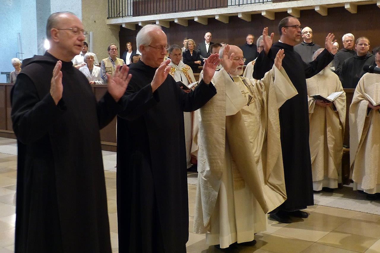 Abt Michael Reepen dankte den Jubilaren zu Beginn des Gottesdienstes für ihre Treue und den Einsatz für unsere Gemeinschaft. Feierlich erneuerten sie vor dem Abt und der Klostergemeinschaft ihr Versprechen, nach der Regel des heiligen Benedikt zu leben und sich auch in Zukunft für die Ziele des Klosters und des Ordens einzusetzen.