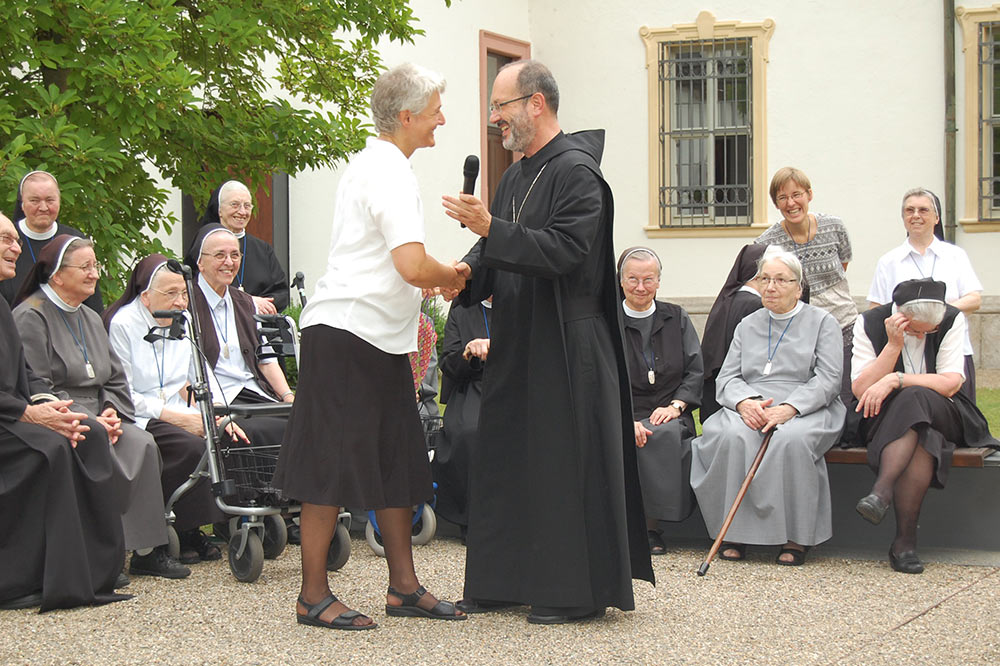 Mit Glockengeläut wurden die Mönche empfangen. Bereits das erste Aufeinanderzugehen war von Offenheit, (Wiedersehens)Freude und Herzlichkeit geprägt. Generaloberin Schwester Katharina Ganz begrüßte die Benediktiner mit einem lateinischen Zitat, das über dem Eingangsportal der Klosterkirche Sankt Michael steht („Dies neue Tor steht nun zum Himmel und zu Gottes Zelle offen...“), augenzwinkernd darauf verweisend, dass die benediktinische Erziehung, die sie im Egbert-Gymnasium in Münsterschwarzach genossen habe, nicht spurlos an ihr vorübergegangen sei.