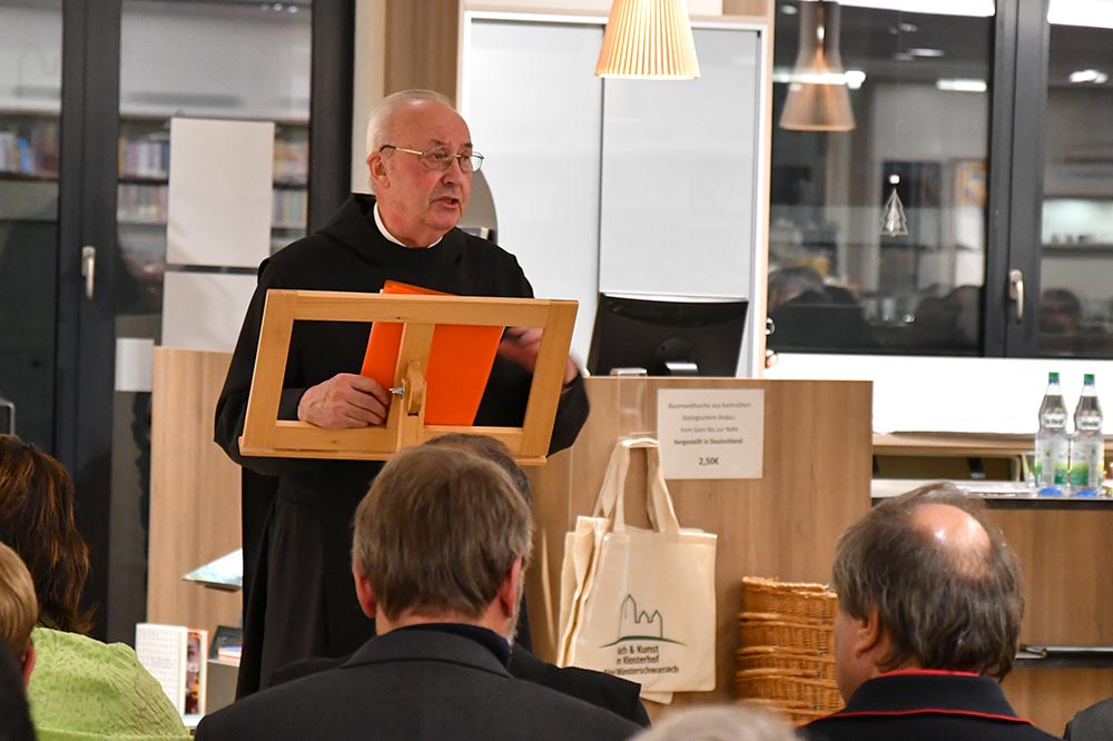 Von diesen Wellenbewegungen und dem missionarischen Wirken der Benediktiner berichteten an diesem Abend auch die Autoren Abt Lambert Dörr, Pater Placidus Berger und Dr. Johannes Mahr. Neben deren Beiträgen, die sich mit der jüngeren Geschichte der Abtei und Persönlichkeiten seit der Wiederbesiedlung 1913 befassen, beleuchtet die Festschrift auch die Anfänge des Klosters an der Schwarzach, setzt sich mit der Gründungsurkunde von Graf Megingaud auseinander oder beschreibt Episoden aus der Zeit des Neubaus des barocken Klosters.