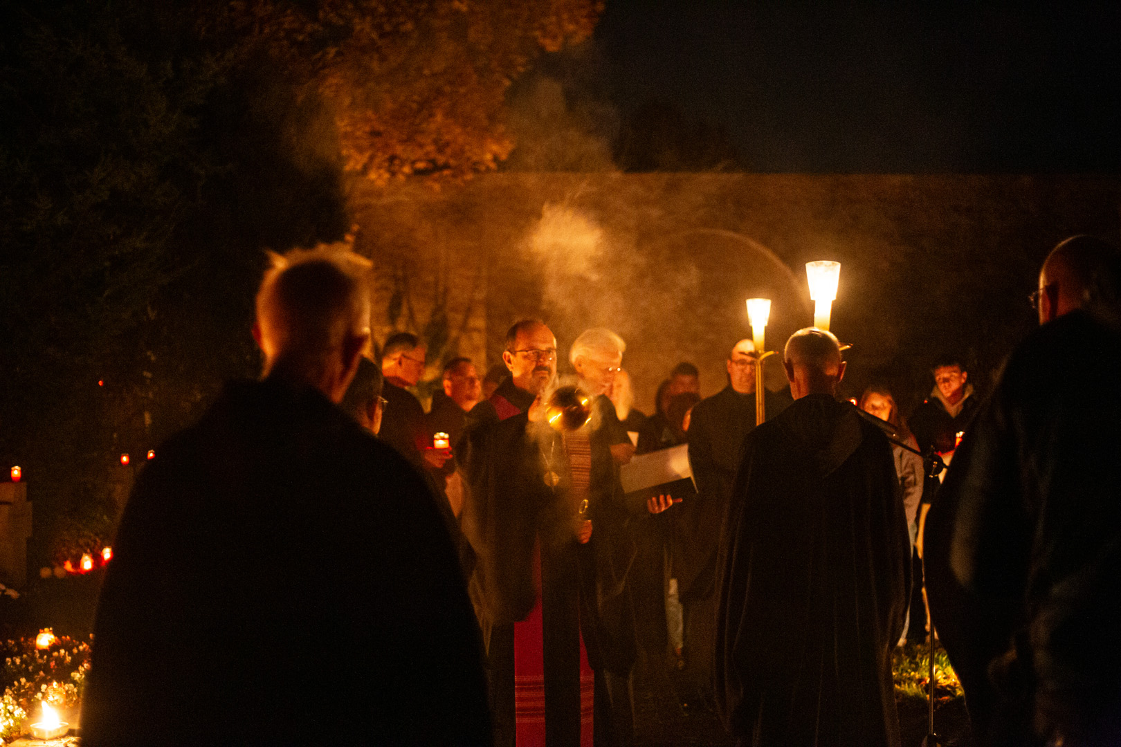 Die Fürbitten später nahmen die Verstorbenen in den Fokus: die Mönche, Verwandten, die Menschen, die auf der Flucht gestorben sind. Im Anschluss an die Komplet konnten die Mönche und Gäste noch Kerzen an die Gräber der verstorbenen Mönche stellen und auf dem Friedhof für ihre Angehörigen beten.