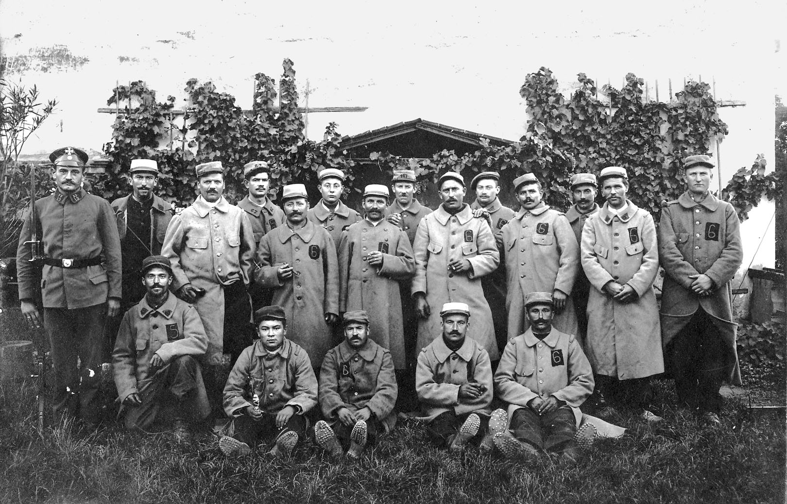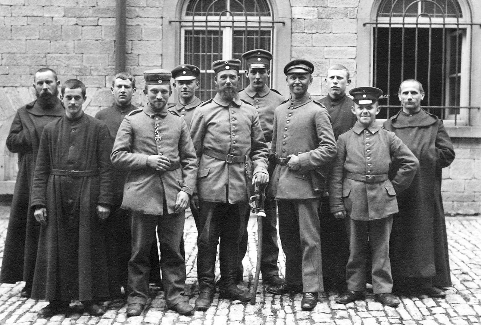 Dass das Jahr 1914 im Verlauf ein sehr schlimmes und der Beginn einer noch schlimmeren Zeit werden sollte, ahnte man da freilich noch kaum. Als im August die Mobilmachung erfolgte, wurde auch die Abtei nicht verschont. Der Großteil des Konvents wurde im Laufe des folgenden Monate eingezogen, allein 31 Mitbrüder in den ersten Tagen, Ende 1914 waren es 44. Zeugnisse und Briefe der Soldatenmönche finden sich ausführlich abgedruckt in "Schwarz aber schön". Das erste Bild zeigt die Soldatenmönche.