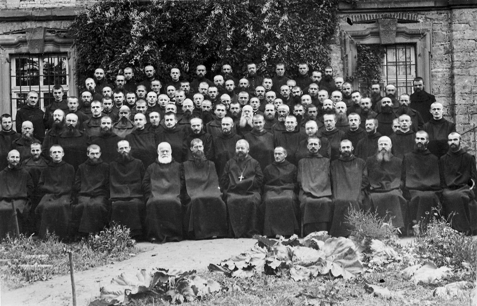 Nun wurde aber der Platz eng, vor allem in der Kapelle. Wie der Konvent anwuchs zeigen die Gruppenbilder von 1919 und 1922. Ein Grund, warum ein Teil des Mönchskonvents noch immer in St. Ludwig lebte - es fehlte an Räumlichkeiten. Also musste alsbald eine Kirche gebaut werden. Doch schon von vornherein war klar: Diese Kirche wird eine Notkirche und perspektivisch, wenn die Folgen des Krieges es zuließen, in Wohnräume umgebaut. Ein Provisorium also.