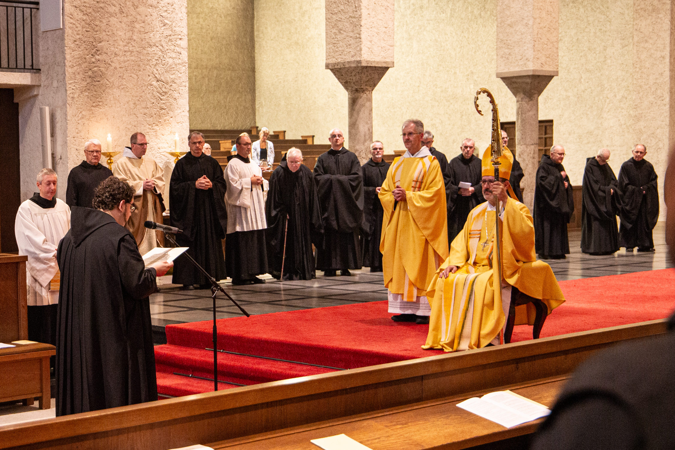 Abt Michael: Die Predigt hält traditionell einer der Jubilare – und im Anschluss daran erneuern alle Jubilare ihr Professversprechen. Sie lesen ihre Professurkunde vor, die sie auch damals vor 25, 40, 50, 60 und mehr Jahren vorgelesen und unterschieben haben. Dabei wird dann ergänzt „wie ich vor so und so vielen Jahren meinem Abt versprochen habe“ und erneuern diese, indem sie auch das jetzige Datum und ihren Namen sagen. Danach wird die Urkunde, wie bei der eigentlichen Profess, auf den Altar gelegt. Dann singen sie gemeinsam das „Suscipe me“, bei dem dann später auch der gesamte Konvent einsetzt.