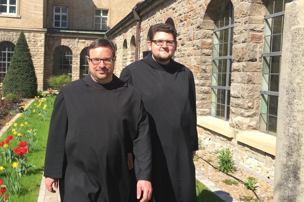 Für Wolfgang Siegler und Jochen Schmidt hat am 15. April die Zeit der klösterlichen Ausbildung begonnen. Nachdem beide schon einige Monate als Postulanten mit uns gelebt haben, wurden sie nun von Abt Michael Reepen OSB ins Noviziat aufgenommen. Das Noviziat ist eine zweijährige Zeit, in der sich die neuen Mitbrüder prüfen, ob der klösterliche Lebensweg für sie ein Weg zum Leben ist. Der Tag der Novizen ist dabei neben der Arbeit und dem Gebet vor allem vom Unterricht geprägt. Sie werden dabei in den unterschiedlichsten Fächern ausgebildet. Neben Abteigeschichte, Liturgie und Gregorianik steht vor allem das Studium der Benediktsregel im Mittelpunkt des Unterrichts. Schließlich ist die Regel unseres Ordensvaters Benedikt von Nursia die Grundlage unseres gemeinsamen Lebens und der Novize „soll wissen was der Eintritt für ihn bedeutet.“ (RB 58,12)
