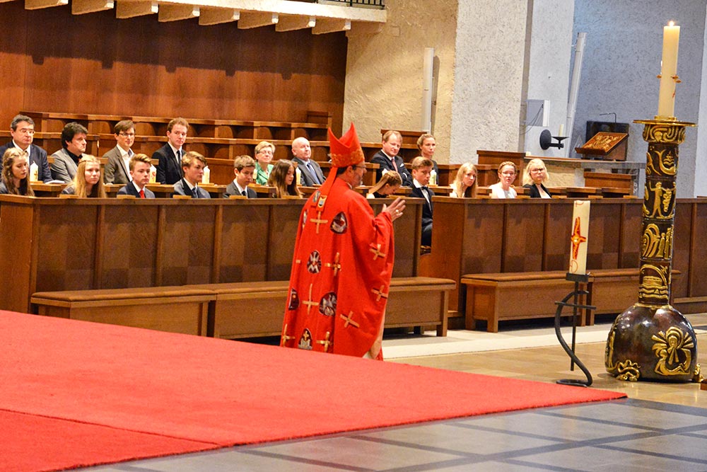 Nach der Predigt wurden die Firmlinge einzeln mit Namen aufgerufen, die mit einem „Hier bin ich“ an den Altar traten. Nach dem Glaubensbekenntnis stellen sich die Paten hinter die Firmlinge, die sich dann lang ausgestreckt auf den Boden legten: Damit brachten sie ihre Bereitschaft zum Ausdruck, sich von Gottes Geist stärken zu lassen. Danach legte Abt Michael jedem Firmling die Hand auf und salbte ihn mit Chrisamöl. Die Firmpaten entzündeten danach die Firmkerze an der Osterkerze und überreichten sie dem Firmling. - Den Gottesdienst feierte Abt Michael in Konzelebration mit Schulseelsorger P. Zacharias Heyes OSB, P. Jesaja Langenbacher OSB und Pfarrer Matthias Konrad. Die Schulband um Michael Aust sorgte für den muisikalischen Rahmen.