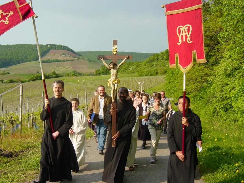 Wir wallten am 2.Mai 2009 um 17:00 in Oberschwarzach los, um begleitet von Blasmusik, das Schwarzacher Hörnli zu besteigen. Die Aufbruchsstimmung kündigte sich schon in der Natur an: die Sonne lachte, die Landschaft blühte und wir stiegen durch die fränkischen Weinberge des Herren hinauf zur über uns liegenden Nothelferkapelle. Von kleinen Impulsen begleitet hatte jeder von uns Gelegenheit sowohl einen Blick auf seine persönliche Sendung zu werfen als auch die herrliche Aussicht zu genießen.