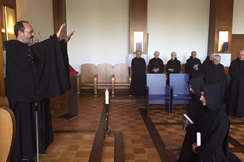 Münsterschwarzach ist ein Ort, wo Menschen nach Gott suchen. Ob sie ins Gästehaus kommen, in die Buchhandlung mit ihrer Literatur oder eben in die Klausur eintreten, um Mönch zu werden. Am Freitag den 15. Mai 2015 nahm Abt Michael unsere beiden Postulanten Daniel Walura und Johannes Ullrich ins Noviziat auf. Es ist ein Jahr der Ausbildung zum Mönch, um sich achtsam einzuüben, in der Gegenwart Gottes zu leben und Ihn in allem zu suchen und zu entdecken. Als Zeichen für ihren neuen Weg bekamen die Novizen einen neuen Namen. Daniel wird in Zukunft Bruder Makarius heißen und Johannes bekam den Namen Bruder Lorenz. Wer den Weg der Gottsuche im Kloster beginnt, muss schon etwas von Gott erfahren haben. So wünschen wir den beiden, dass sie in dieser Erfahrung wachsen und ihren Weg in Treue, Freude und Hoffnung beschreiten.