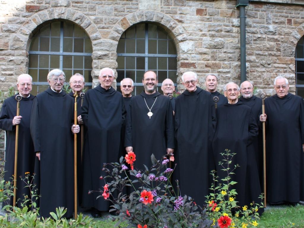 fast allen anderen Stäben im Alltag, eine Stütze für das Alter sein, sondern er soll die Mönche daran erinnern, dass alle Menschen als Kreuzträger unterwegs sind. Im Zeichen des Kreuzes haben die Mönche bei der Profess den Klosterweg begonnen. Am Kreuz geht kein Weg vorbei. Und jeder hat täglich sein Kreuz zu tragen. Wichtig ist, was die Menschen daraus machen. Pater Germar ging auch auf den Festtag des Tages ein, das Kirchweihfest der Abteikirche. Vor über 70 Jahren haben damals die Mönche die heutige gewaltige Abteikirche gebaut. Das Hauptschiff der Kirche kreuzt sich mit den zwei Seitenschiffen vorne beim Altar. So sollen auch die Mönche und die Kirchenbesucher täglich das Kreuz vor Augen haben.