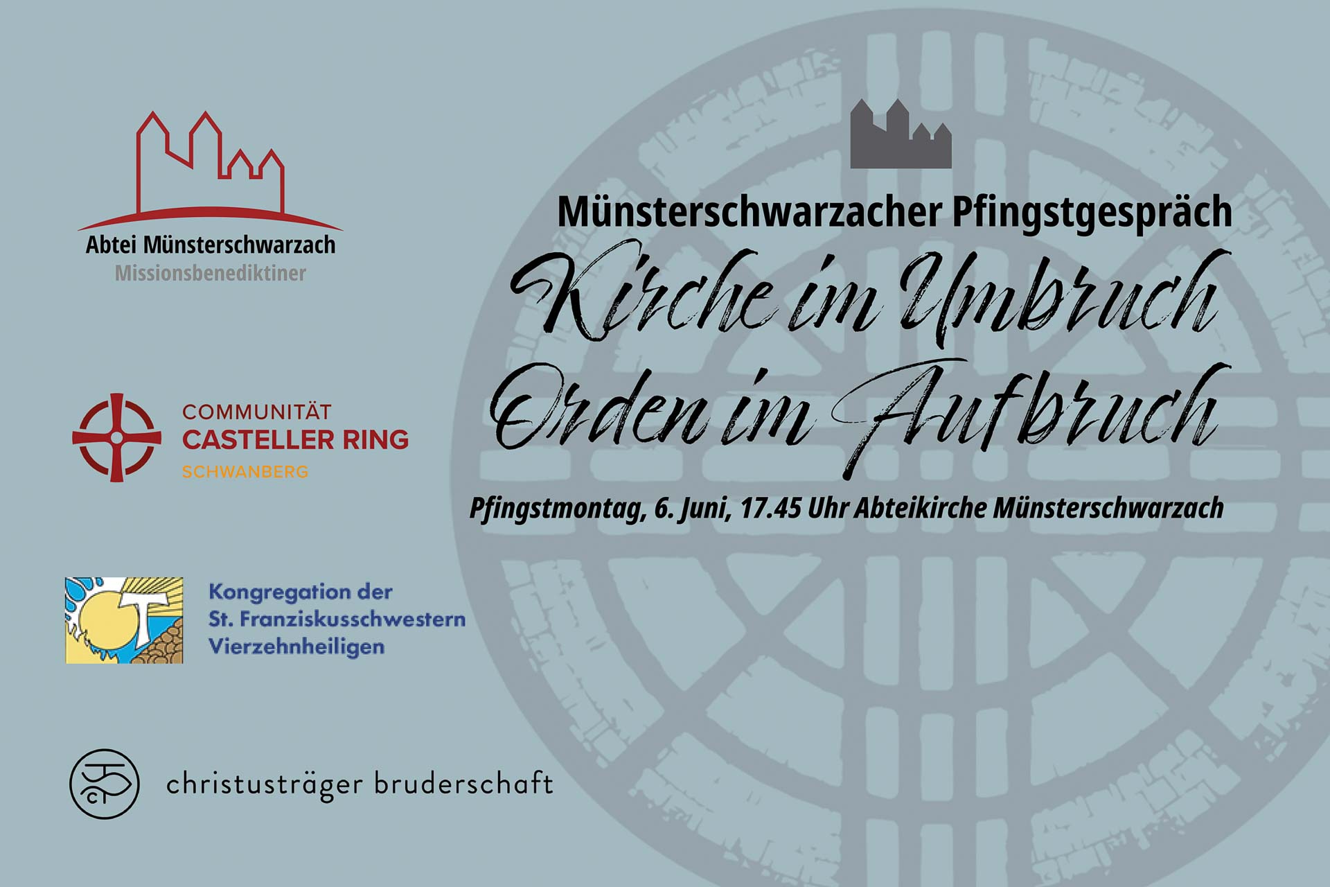Am Pfingstmontag, 6. Juni, lädt die Abtei Münsterschwarzach um 17.45 Uhr in die Abteikirche ein. Gemeinsam mit der evangelischen Communität Casteller Ring vom Schwanberg, der Kongregation der Franziskusschwestern aus Vierzehnheiligen sowie der Christusträger Bruderschaft aus Triefenstein möchten die Benediktiner aus Münsterschwarzach in diesem Gottesdienst besondere Hoffnungsworte an die Besucherinnen und Besucher richten. In kurzen Impulsen werden Abt Michael Reepen OSB (Münsterschwarzach), Priorin Sr. Ursula Buske CCR (Schwanberg), Kongregationsleiterin Sr. M. Regina Pröls (Vierzehnheiligen) und Hausleitung Br. Christian Hauter (Triefenstein) zum Titel „Kirche im Umbruch, Orden im Aufbruch“ ihre Gedanken teilen.