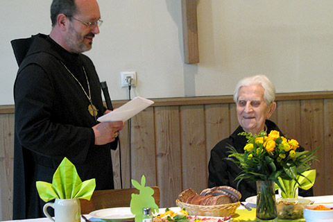 Bruder Balduin Weth feierte gestern seinen 95. Geburtstag und ist damit der älteste Mönch unserer Abtei. Der Jubilar wurde am 13. April 1920 in Vasbühl (Kreis Schweinfurt) als Isidor Weth geboren und ist der einzige noch lebende Mönch, der beim Bau der großen Abteikirche von 1935 bis 1938 mitarbeitete.