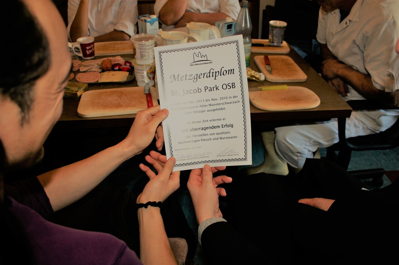 Mit der Metzgerlehre betrat Bruder Jacob noch einmal ein ganz neues Berufsfeld, war er doch zuvor auf der Krankenstation seines koreanischen Heimatklosters tätig. Bevor er am 2. Dezember die Heimreise antrat, wurde ihm von seinem Meister Alfred Kolerus und dem Geschäftsführer der Vier-Türme GmbH P. Christoph Gerhard mit einer Urkunde bescheinigt, dass er sein Handwerk beherrscht und in der Lage ist, qualitativ hochwertige Fleisch- und Wurstwaren herzustellen.