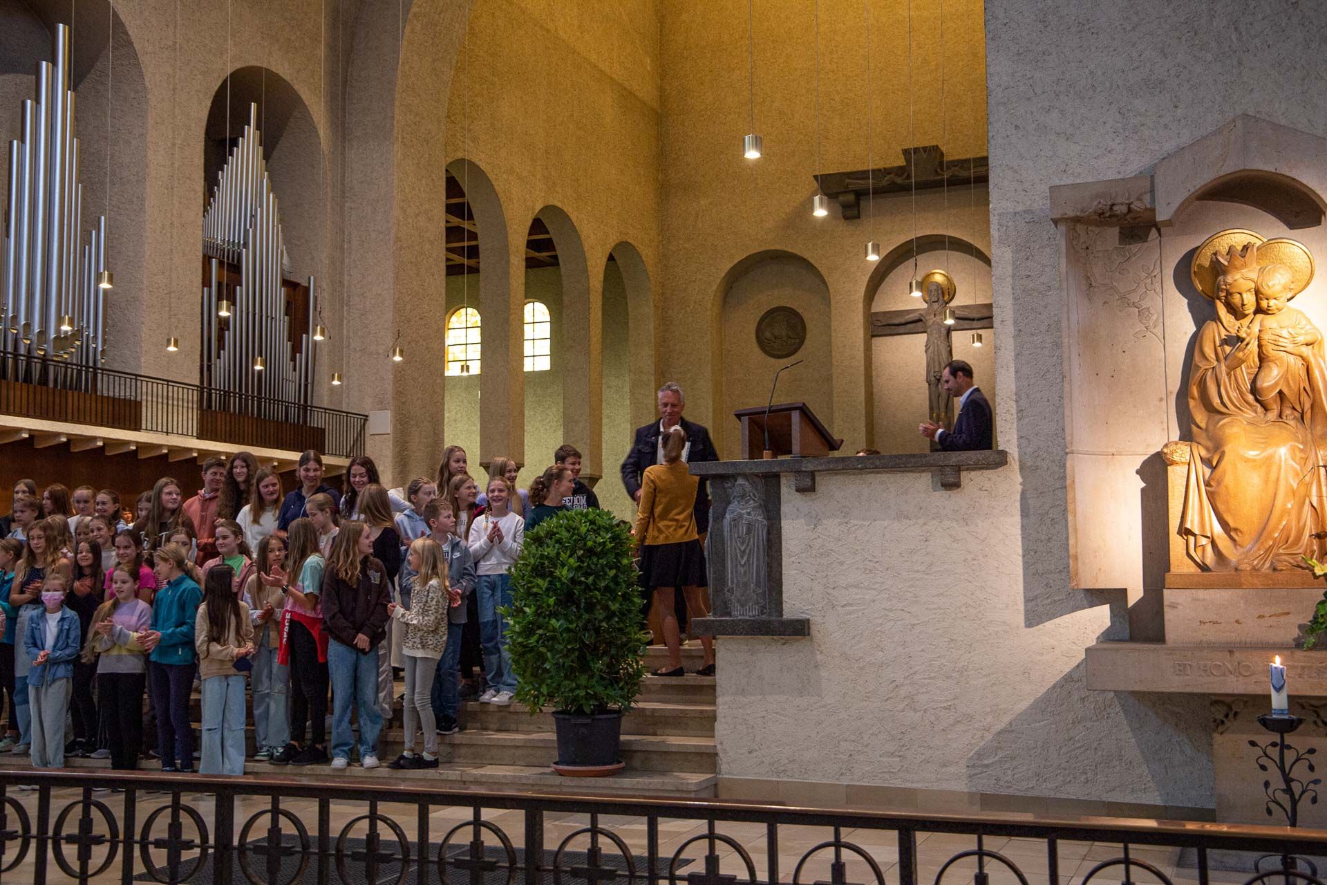 Das neue Jahresmotto lade dazu ein, genau hinzuschauen, was die Mitschülerinnen und Mitschüler wirklich brauchen würden und zu hören, was sie sich wünschen. Zuversichtlich dürfe die Schulfamilie darauf hoffen, dass Gott mit seinem Segen begleite. Zu einem Einzelsegen in den Seitenkapellen und im Altarraum lud der Schulseelsorger im Anschluss ein. Begleitet wurde der Gottesdienst musikalisch durch die Band aus Lehrern und Schülern.
