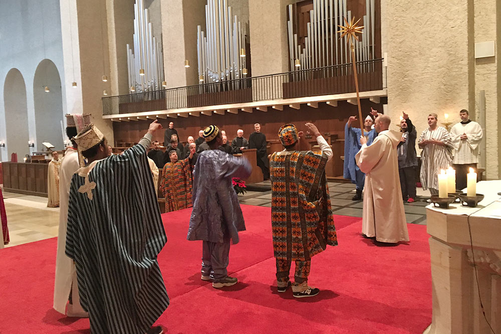 Erstmals haben neben Mönchen auch Flüchtlinge beim traditionellen „Dreikönigsspiel“ mitgewirkt, das beim Gottesdienst am Hochfest Erscheinung des Herrn, 6. Januar, in der Abteikirche aufgeführt wurde. Die sieben im Kloster untergebrachten jungen Männer gehören verschiedenen christlichen Denominationen an und stammen aus Eritrea und dem Iran.