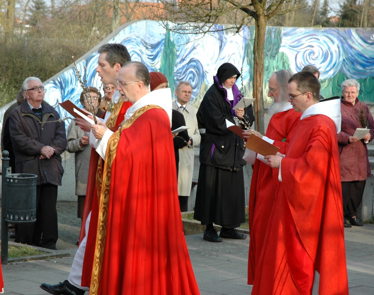 Wie damals Jesus in Jerusalem, so zogen die Mönche am Palmsonntag unter Gesängen und mit Palmzweigen in den Händen in die Abteikirche ein. Abt Michael leitete die Karwoche ein „als letztes Stück des Weges der Fastenzeit, als Auf- oder Abstieg auf Ostern hin. Manchmal kann das letzte Stück noch mal recht anstrengend sein, einem Schweiß und Kraft kosten, aber die Sehnsucht nach dem Ziel lässt weitergehen und Ostern werden“.