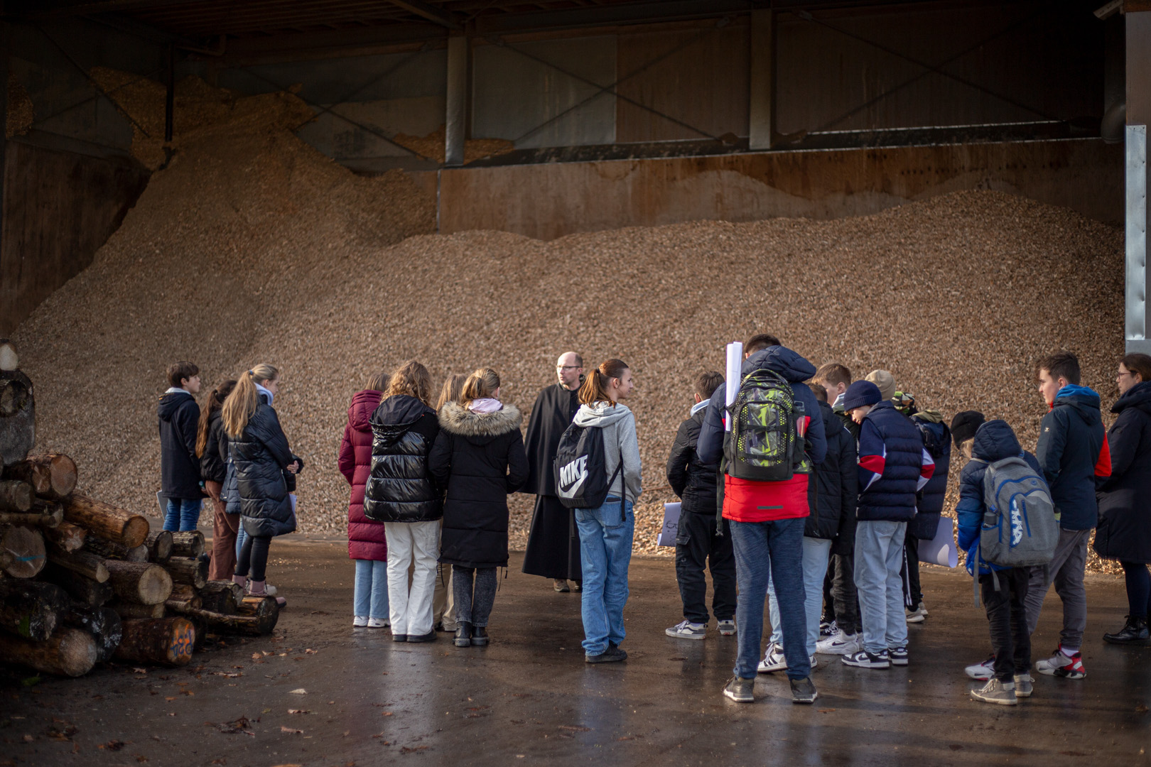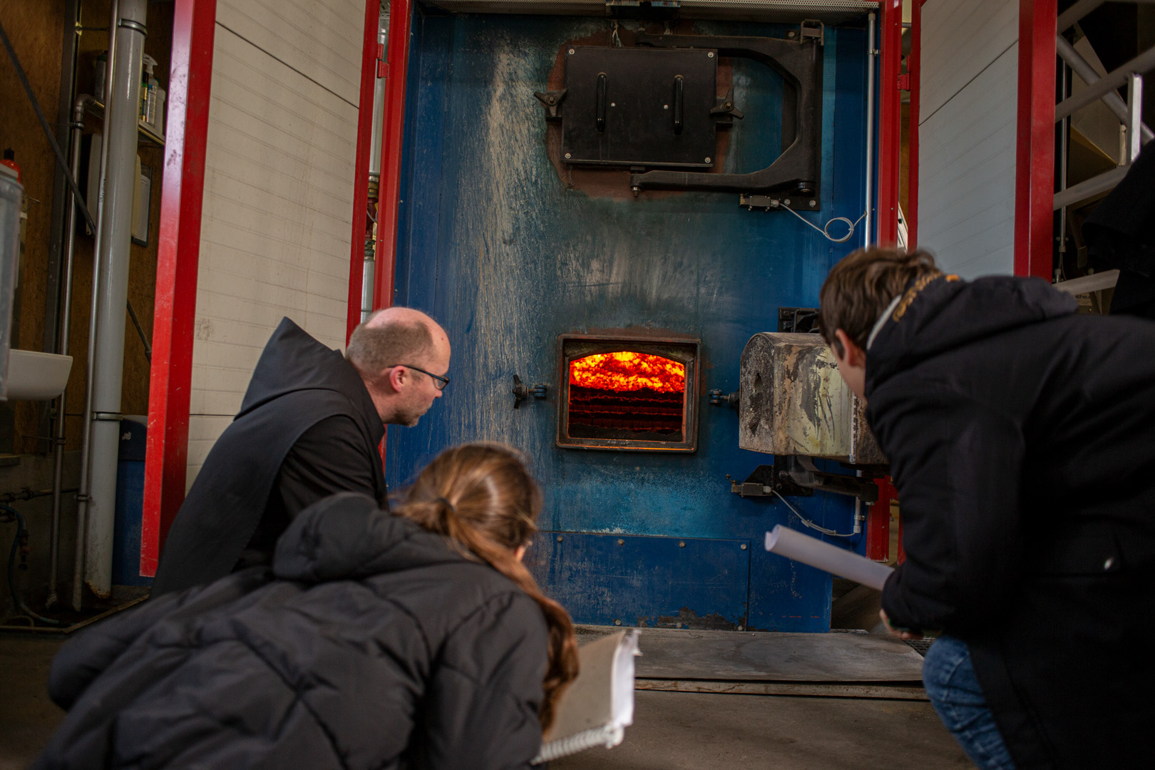 Vor allem beim großen Energiebedarf des Heizens zeige sich das, so P. Maximilian bei der anschließenden Besichtigung der großen Hackschnitzelheizung. Das Holz kommt aus dem nahegelegenen Steigerwald und ist ausschließlich Abfallholz, das im Sägewerk nicht verwendet werden kann. Mit der Heizenergiezentrale, die 2003 gebaut wurde, kann die Abtei 85 Prozent ihres Heizbedarfs aller Gebäude auf dem Gelände decken. Die Biogasanlage ergänzt fast den gesamten Rest. Lediglich ein geringer Bruchteil an Öl und damit fossilen Brennstoffen wird noch benötigt.