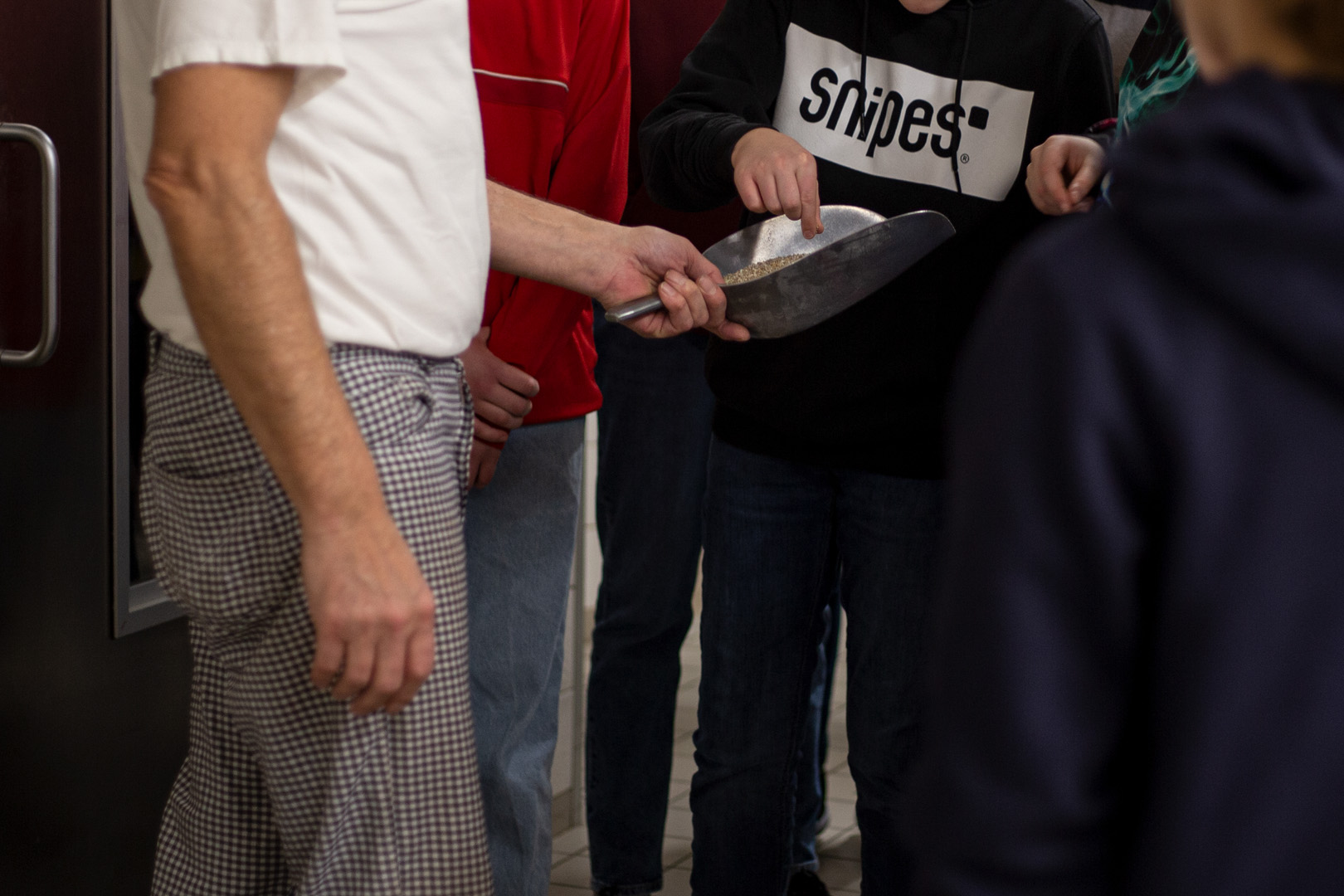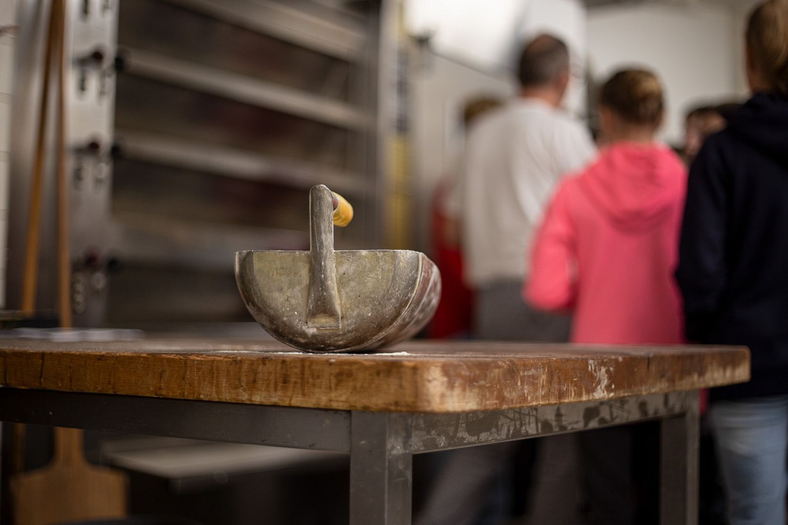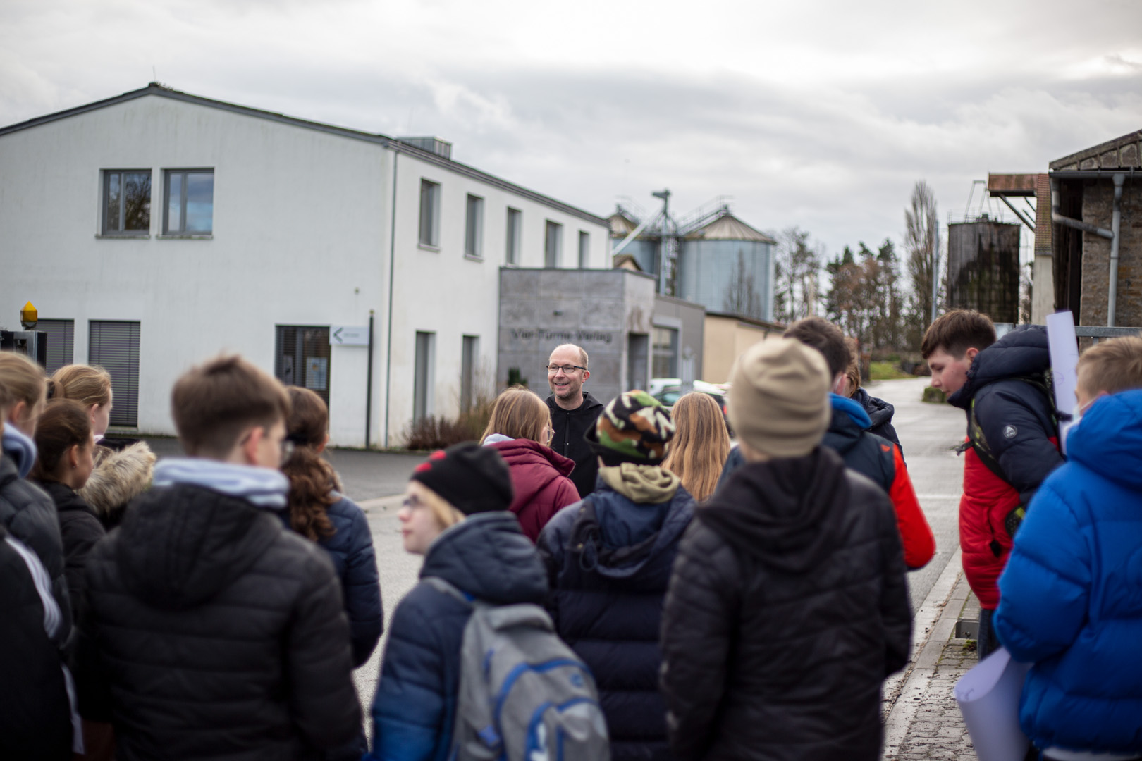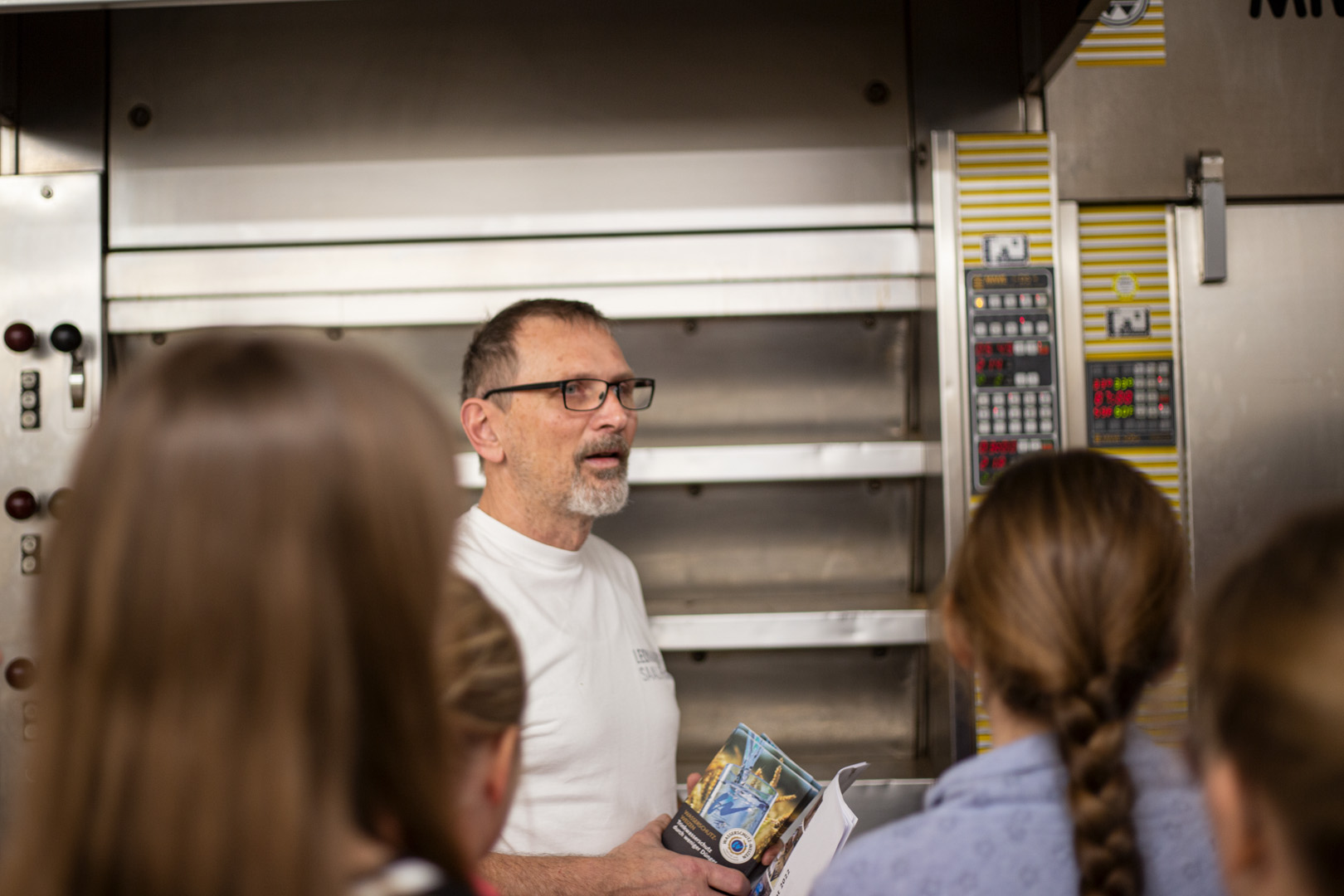 Die Bäckerei ist seit 2019 Wasserschutzbäckerei und hat sich somit bestimmten Richtlinien verpflichtet. Bäckermeister Leo Stöckinger erklärte den Schülerinnen und Schülern zunächst, warum es wichtig sei, das Grundwasser durch bestimmte Maßnahmen zu schonen. Das Wasserschutzprojekt der Bezirke Unter- Ober und Mittelfranken hat genau das zum Ziel – es setzt direkt in der Landwirtschaft an. Diese verzichtet beim Weizenanbau auf die dritte Düngung, was dem Grundwasser zugutekommt. Der zertifizierten Wasserschutzweizen wird dann in bestimmte Mühlen geliefert, wo Wasserschutzmehl entsteht – und das wird wiederum in den teilnehmenden Bäckereien verarbeitet.