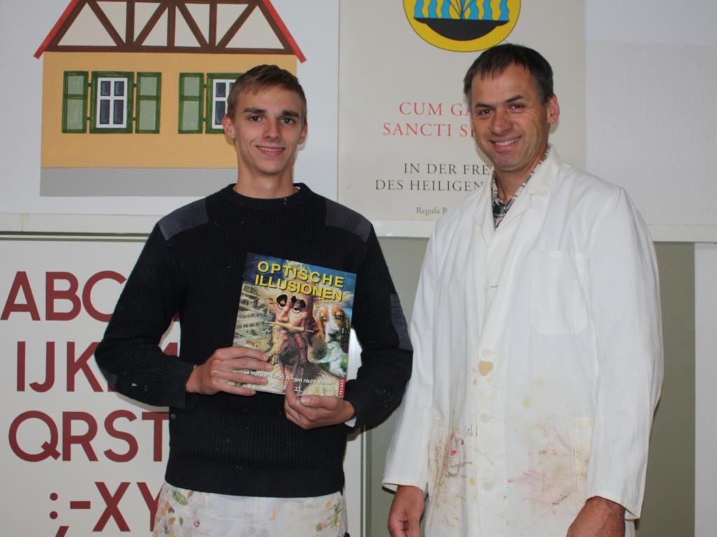 Bruder Alois und sein Team aus der Maler- und Lackiererwerkstatt haben Grund zur Freude. Ihr Lehrling, Oliver Förth, hat seine Gesellenprüfung mit der sensationellen Note 1,0 bestanden. Da dies im Tüncher-Handwerk sehr selten vorkommt und er zudem auch im Berufsschulzeugnis hervorragende Noten hatte, schlug ihn die Würzburger Berufsschule für den Preis der Regierung Unterfrankens vor. Diese Ehrenurkunde und ein Geldpräsent der Regierung bekam er bei der Freisprechungsfeier überreicht.