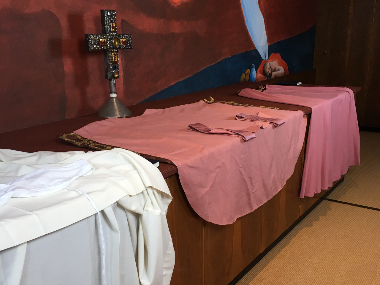 In der Abtei Münsterschwarzach kommt rosa bereits in der Vesper am Vorabend, der eigentliche Beginn des jeweiligen Sonntags, zum Einsatz. Der Offiziator, der die Vesper leitet, und seine Assistenten tragen rosa Chormäntel. Diese besondere liturgische Farbe ist im Kirchenjahr nur an einem einzigen anderen Termin üblich: dem 4. Fastensonntag, der als Laetare-Sonntag die Halbzeit der Fastenzeit markiert.