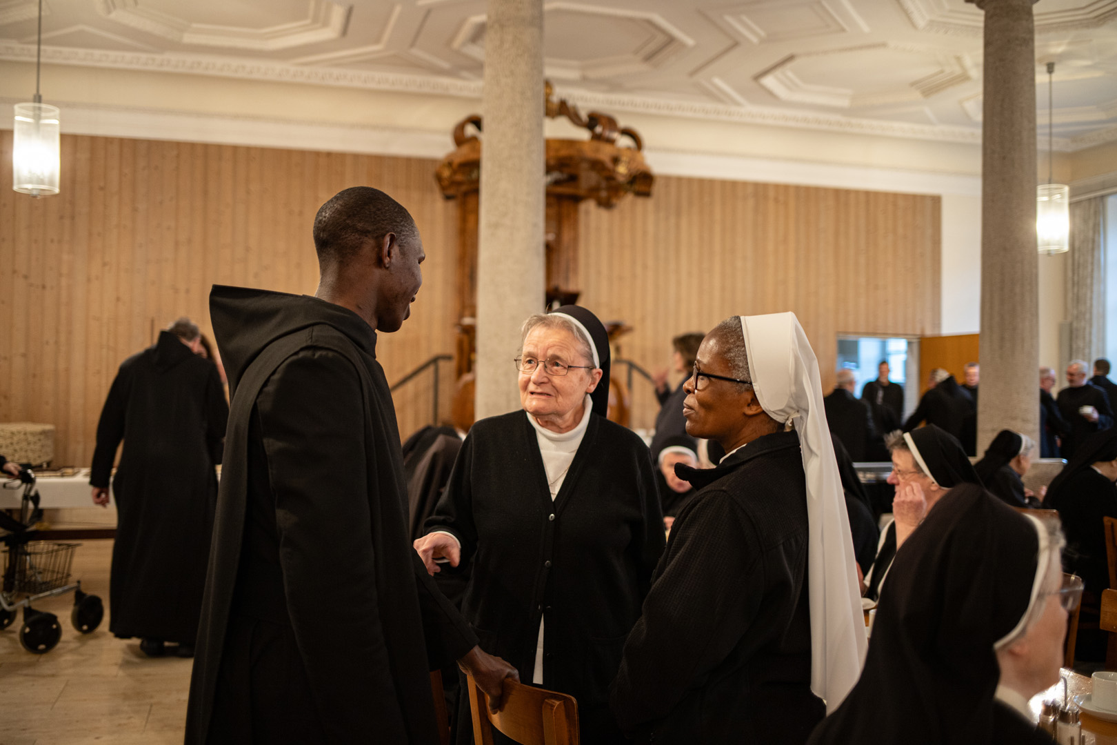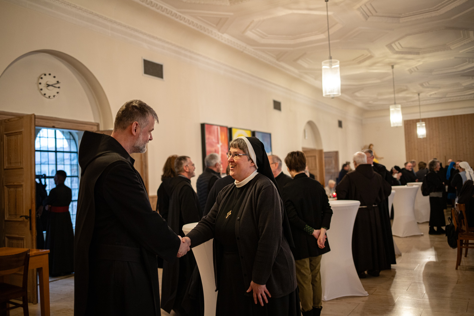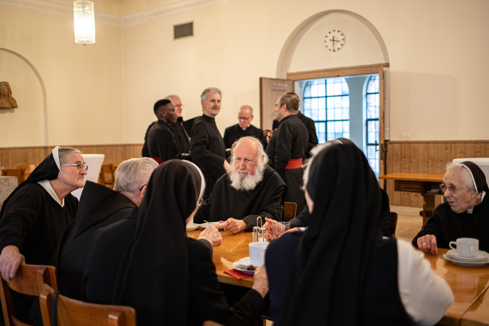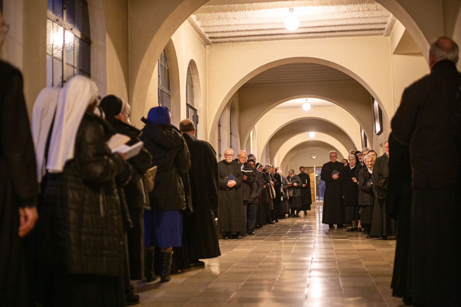 Gemeinsam zogen die Ordensleute im Anschluss zur Vesper in die Abteikirche ein und beteten gemeinsam im Chorgestühl. Das Abendessen im Refektorium schloss den Ordenstag ab, an dem etwa 100 Ordensleute teilnahmen. Die einzelnen Gemeinschaften neben den Mönchen der Abtei Münsterschwarzach: Erlöserschwestern, Ritaschwestern, Dominikanerinnen, Oberzeller Franziskanerinnen, Ursulinen, Missionsfranziskanerinnen des hl. Aloysius Gonzaga, Claretiner, Mariannhiller Missionare, Franziskanerminoriten und Franziskaner, Salesianer Don Boscos, Franziskanerinnen sf, Dillinger Franziskanerinnen, Anbetungsschwestern, Daughters of Mary Mother of Mercy, Gut-Hirtinnen und Schwestern von der Gemeinschaft der Missionshelferinnen