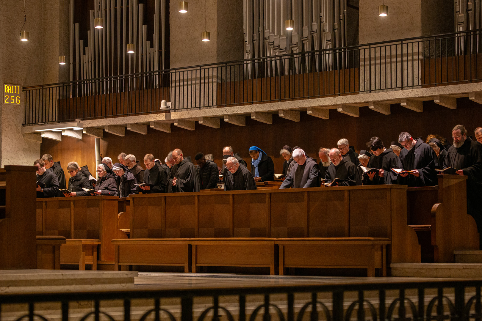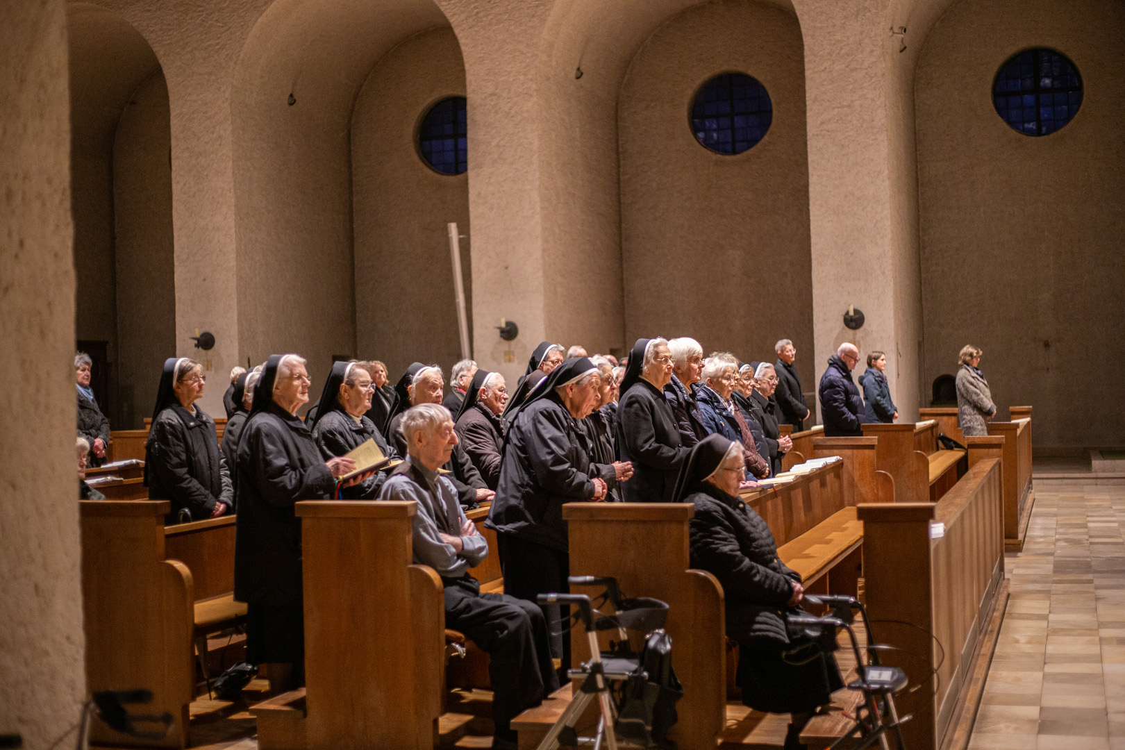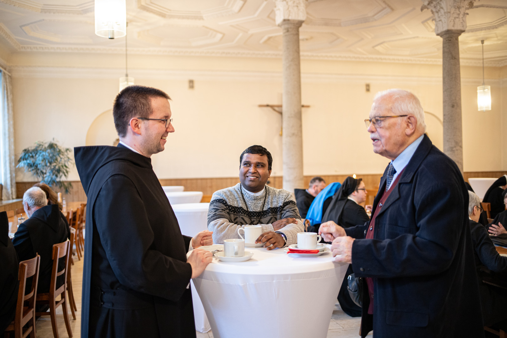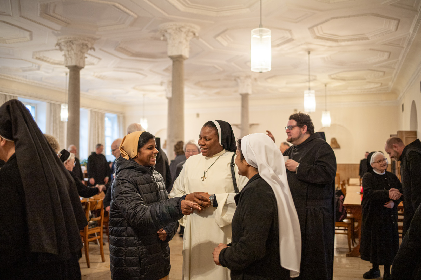 Gemeinsam zogen die Ordensleute im Anschluss zur Vesper in die Abteikirche ein und beteten gemeinsam im Chorgestühl. Das Abendessen im Refektorium schloss den Ordenstag ab, an dem etwa 100 Ordensleute teilnahmen. Die einzelnen Gemeinschaften neben den Mönchen der Abtei Münsterschwarzach: Erlöserschwestern, Ritaschwestern, Dominikanerinnen, Oberzeller Franziskanerinnen, Ursulinen, Missionsfranziskanerinnen des hl. Aloysius Gonzaga, Claretiner, Mariannhiller Missionare, Franziskanerminoriten und Franziskaner, Salesianer Don Boscos, Franziskanerinnen sf, Dillinger Franziskanerinnen, Anbetungsschwestern, Daughters of Mary Mother of Mercy, Gut-Hirtinnen und Schwestern von der Gemeinschaft der Missionshelferinnen