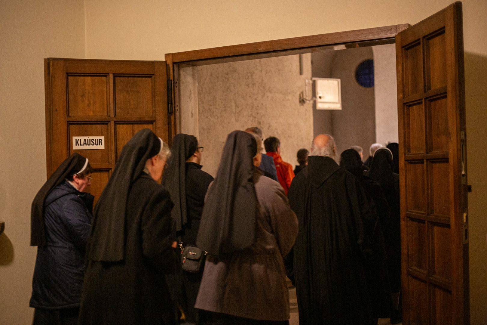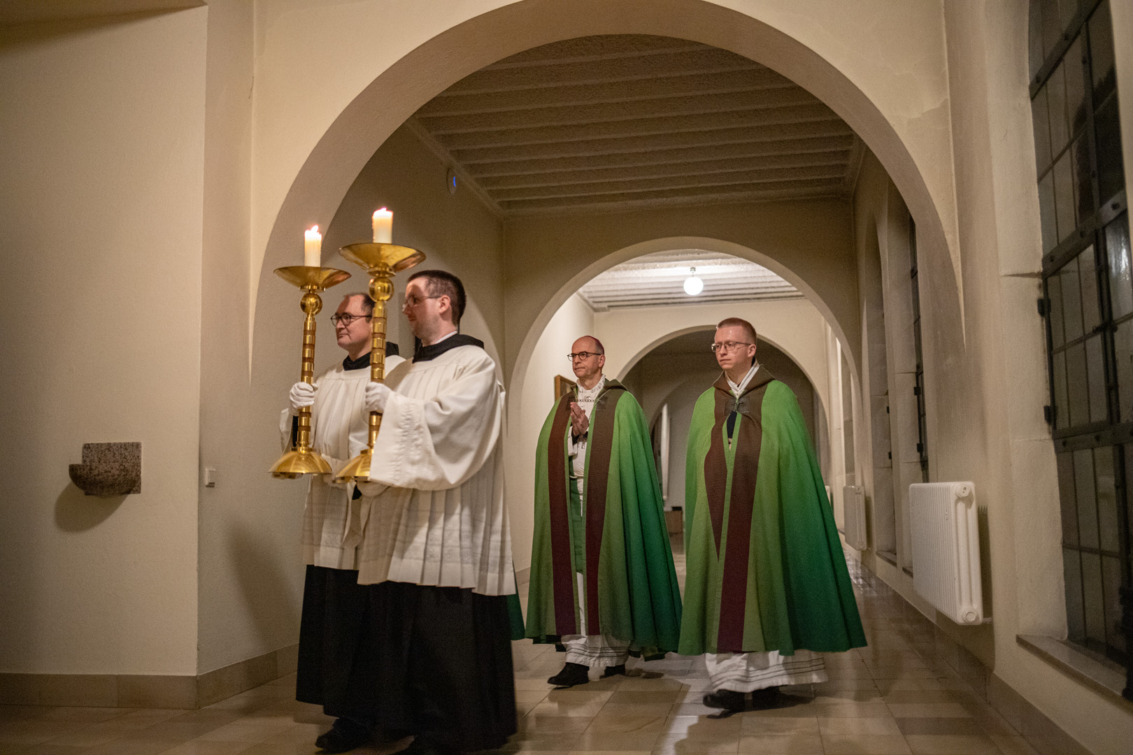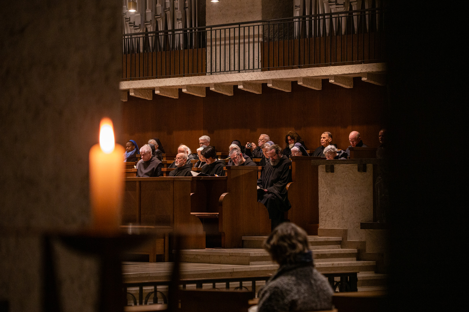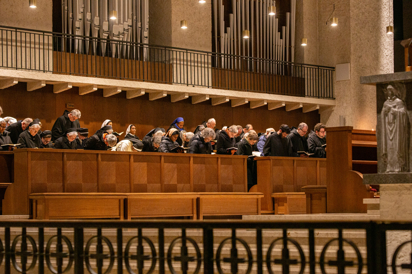 Gemeinsam zogen die Ordensleute im Anschluss zur Vesper in die Abteikirche ein und beteten gemeinsam im Chorgestühl. Das Abendessen im Refektorium schloss den Ordenstag ab, an dem etwa 100 Ordensleute teilnahmen. Die einzelnen Gemeinschaften neben den Mönchen der Abtei Münsterschwarzach: Erlöserschwestern, Ritaschwestern, Dominikanerinnen, Oberzeller Franziskanerinnen, Ursulinen, Missionsfranziskanerinnen des hl. Aloysius Gonzaga, Claretiner, Mariannhiller Missionare, Franziskanerminoriten und Franziskaner, Salesianer Don Boscos, Franziskanerinnen sf, Dillinger Franziskanerinnen, Anbetungsschwestern, Daughters of Mary Mother of Mercy, Gut-Hirtinnen und Schwestern von der Gemeinschaft der Missionshelferinnen