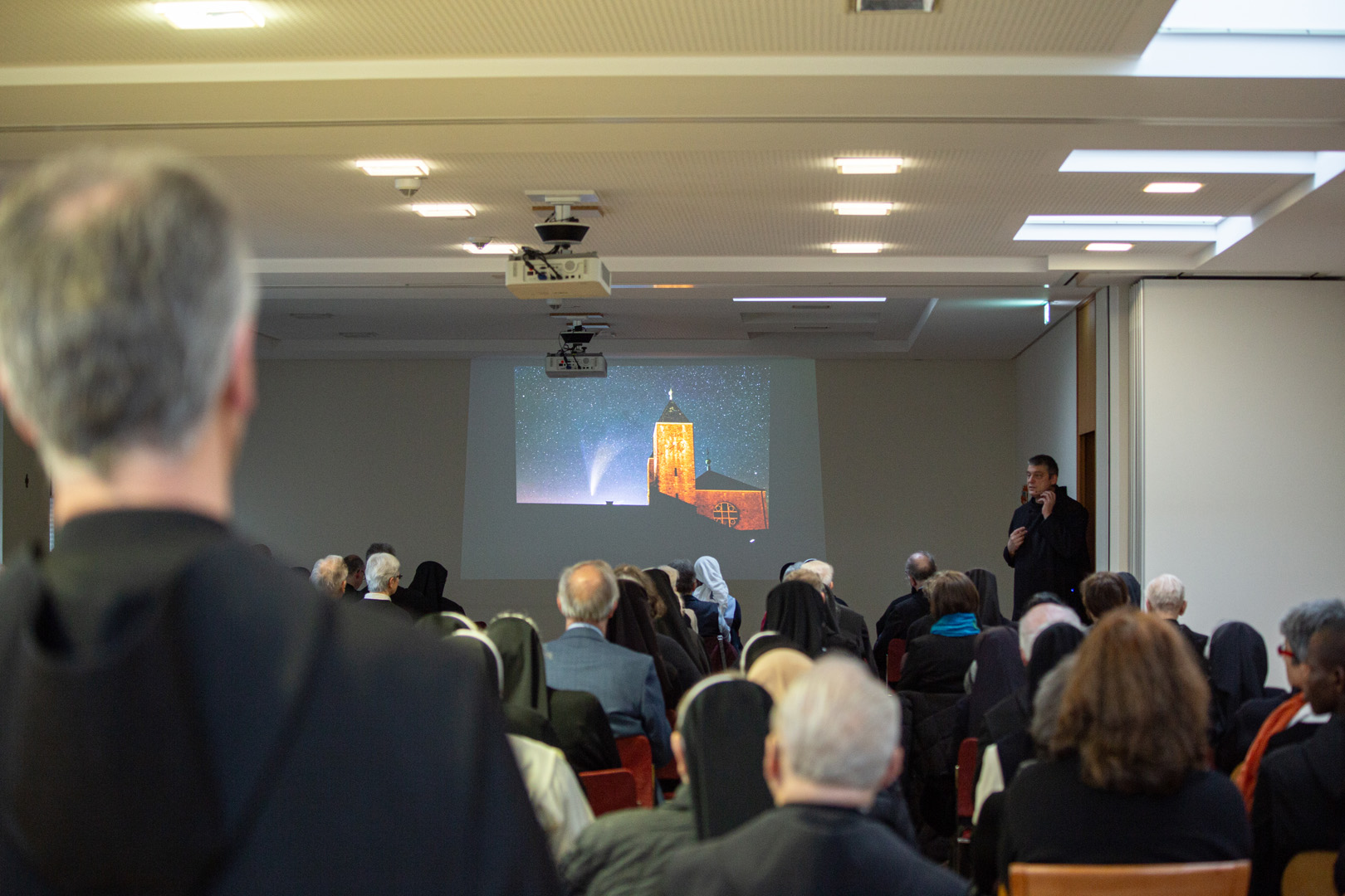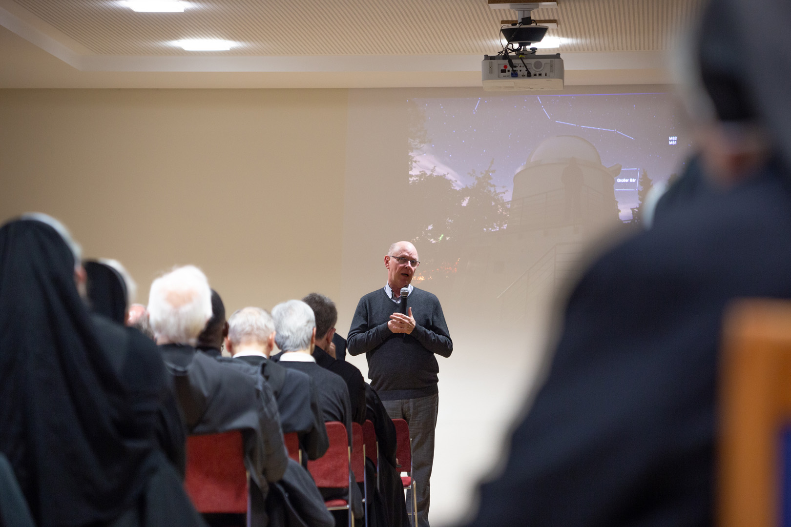 P. Christoph zeigte in seinem Impuls auf, was Gott und der Glaube für ihn mit Astronomie zu tun haben. Das schließe sich für ihn nämlich nicht aus, sondern das eine könne ohne das andere gar nicht funktionieren: „Beim Blick ins All merke ich, wie groß und wie großartig Gott unser Schöpfer eigentlich denkt.“ Besonders eindrücklich wurde das für die Ordensleute anhand der fantastischen Fotografien, die der Klosterastronom zeigte. Bereits seit den 70er-Jahren schaue er in die Sterne und die Faszination dafür bleibe.