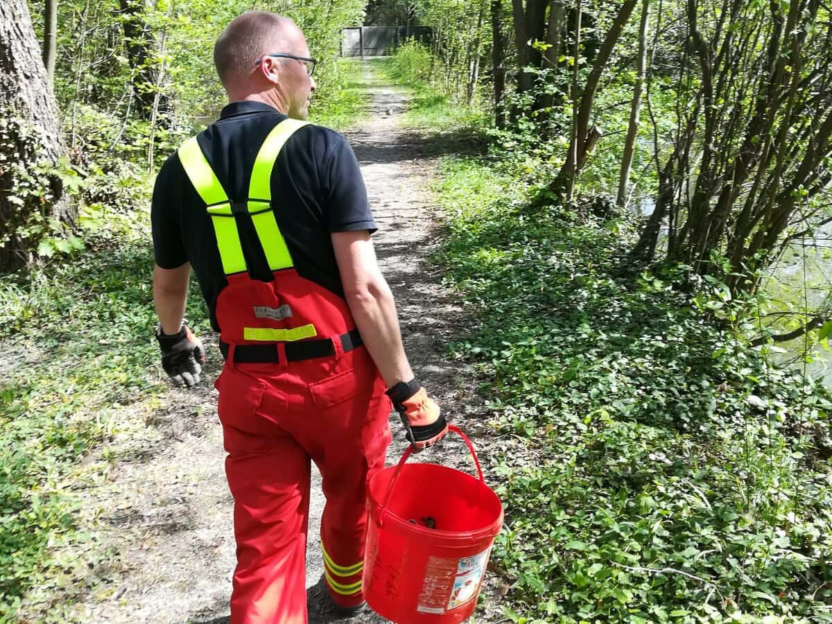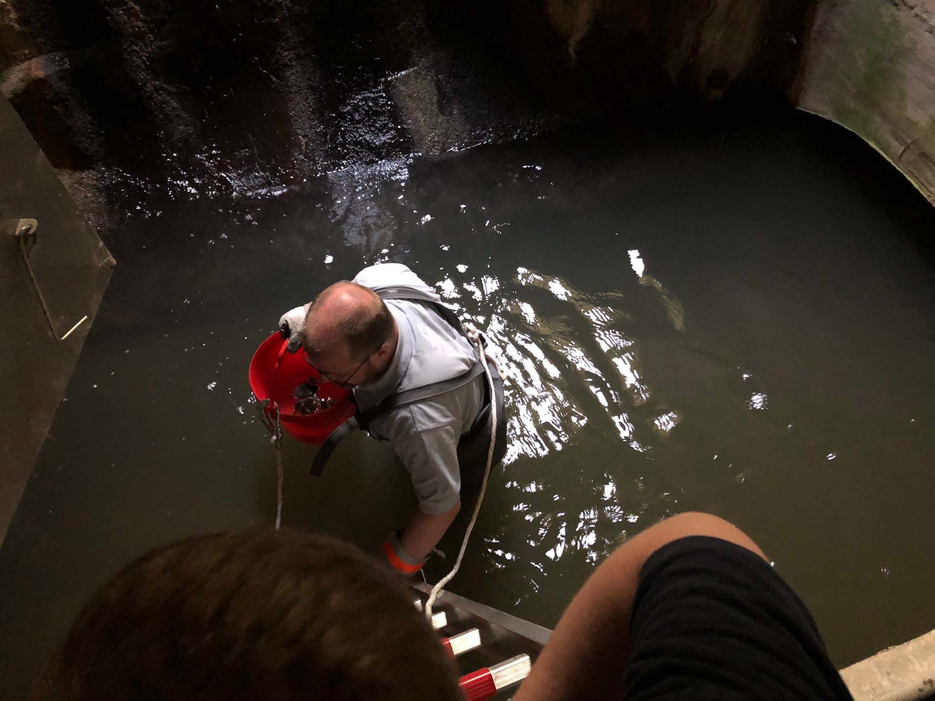 Mit Wathose, Feuerwehrgurt und Handschuhen ausgerüstet und durch eine Leine gesichert, stieg Br. Melchior in den Kanal und sammelte zunächst die fünf Küken ein. Diese konnten anschließend einfach in einem Eimer nach draußen getragen werden. Schwieriger gestaltete es sich, die Entenmutter ins Frei zu befördern. Letztlich gelang es aber, dass sie durch ein geöffnetes Abdeckgitter von allein nach draußen flog. Am Klosterweiher ganz in der Nähe wurden die Küken schließlich wieder ins Wasser gesetzt, so dass Mutter und Kinder sich wieder finden konnten.