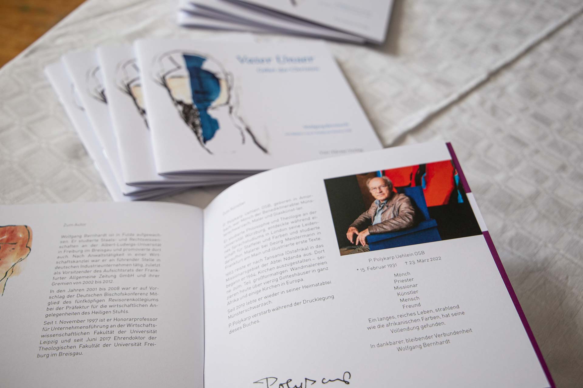 „Die Illustrationen sind wahrscheinlich die letzten, die P. Polykarp gemalt hat“, erklärt Matthias Gahr, der gemeinsam mit Wolfgang Bernhardt die Gestaltung des Buchs mit den passenden Bildern verantwortet hat. Nicht die erste Zusammenarbeit, denn der Autor ist im Vier-Türme-Verlag kein Unbekannter. In seinem Buch „Heiteres über die (Un-)Ordnung der Wirtschaft“ aus dem Jahr 2020 beschäftigt sich der Professor für Unternehmensführung mit Erfolgen und Misserfolgen in der Wirtschaft. Für sein Buch „Sonnengesang – Franziskus von Assisi" von 2021 hat er die Texte des Sonnengesangs auf Deutsch, Englisch, im italienischen Original (volgare umbro), auf Spanisch, Suaheli und Japanisch gesammelt. Beide Bücher enthalten Illustrationen von P. Polykarp. Diesen hatte Bernhardt bei seinen Reisen in die Missionsklöster kennen und seine Kunst schätzen gelernt.