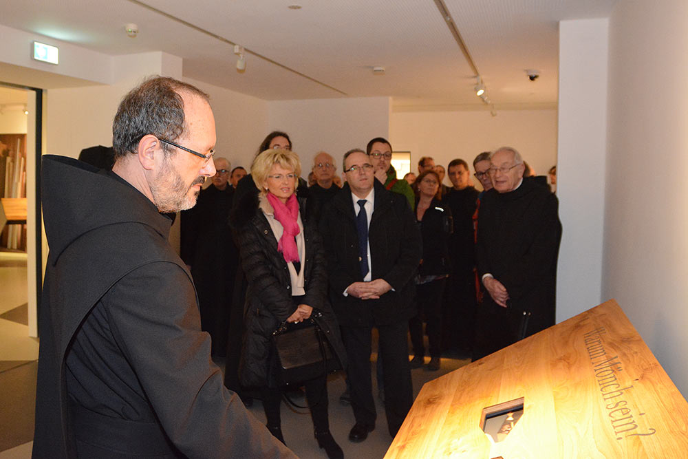Museumsgestalter Matthias Kutsch (Erlangen) führte durch das in der deutschen Klosterlandschaft wohl einmalige Projekt. „Der Weg des Heils ist nur in einem engen Anfang zu beginnen“ wird gleich am Zugang die Benediktsregel zitiert. So führt der Weg durch einen engen Gang, an dessen Ende das großformatige Bild eine Gruppe von Mönchen zu sehen ist. Im ersten der beiden Ausstellungsräume, in denen die Materialien Stahl, Eichenholz und Messing dominieren, wird nach dem „Warum“ gefragt. Warum Mönch sein? Dort kann man einen Blick in die Benediktsregel werfen oder ein Kunstwerk von Pater Meinrad Dufner OSB mit dem vielsagenden Titel „Segen und Sägen“ sehen.