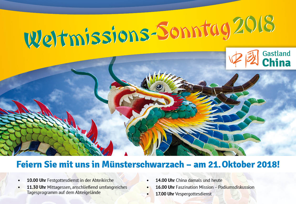 Ein Festgottesdienst um 10 Uhr mit traditioneller chinesischer Musik und Gesängen der chinesischen Katholiken am Rhein eröffnet den Weltmissionssonntag. P. Norbert Du wird predigen. Beim anschließenden Mittagessen in der Egbert-Halle ab 11.30 Uhr bietet sich die Gelegenheit mit ihm und anderen Mönchen ins Gespräch zu kommen.