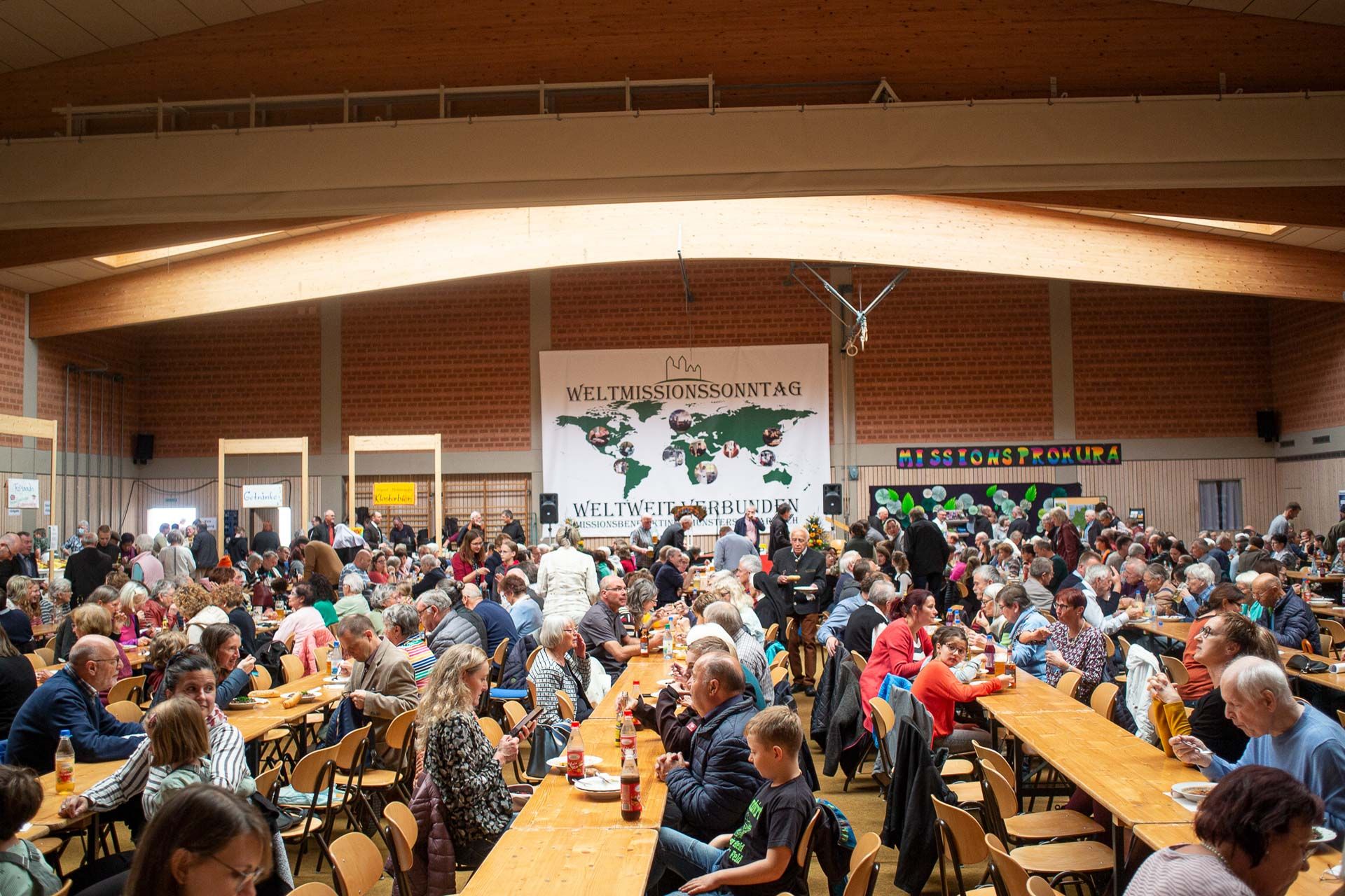 Diese Baumpflanzaktion und die Erinnerung an das gemeinsame Haus stellte auch Bischof Franz ins Zentrum seines Grußwortes im Anschluss beim brasilianischen Mittagessen in der Egbert-Halle. Bischof John Ndimbo erwähnte in seinem Grußwort den Besuch von Bischof Franz in Mbinga 2021 und führte aus, wie wichtig der persönliche Kontakt für die Bistumspartnerschaften sei. Der Austausch miteinander und das persönliche Gespräch seien auch die Anliegen des Weltmissionssonntages, fasste der neue Missionsprokurator Br. Abraham Sauer zusammen und lud die Gäste ein, sich die zahlreichen Angebote der Abtei und ihren Betrieben näher anzusehen.