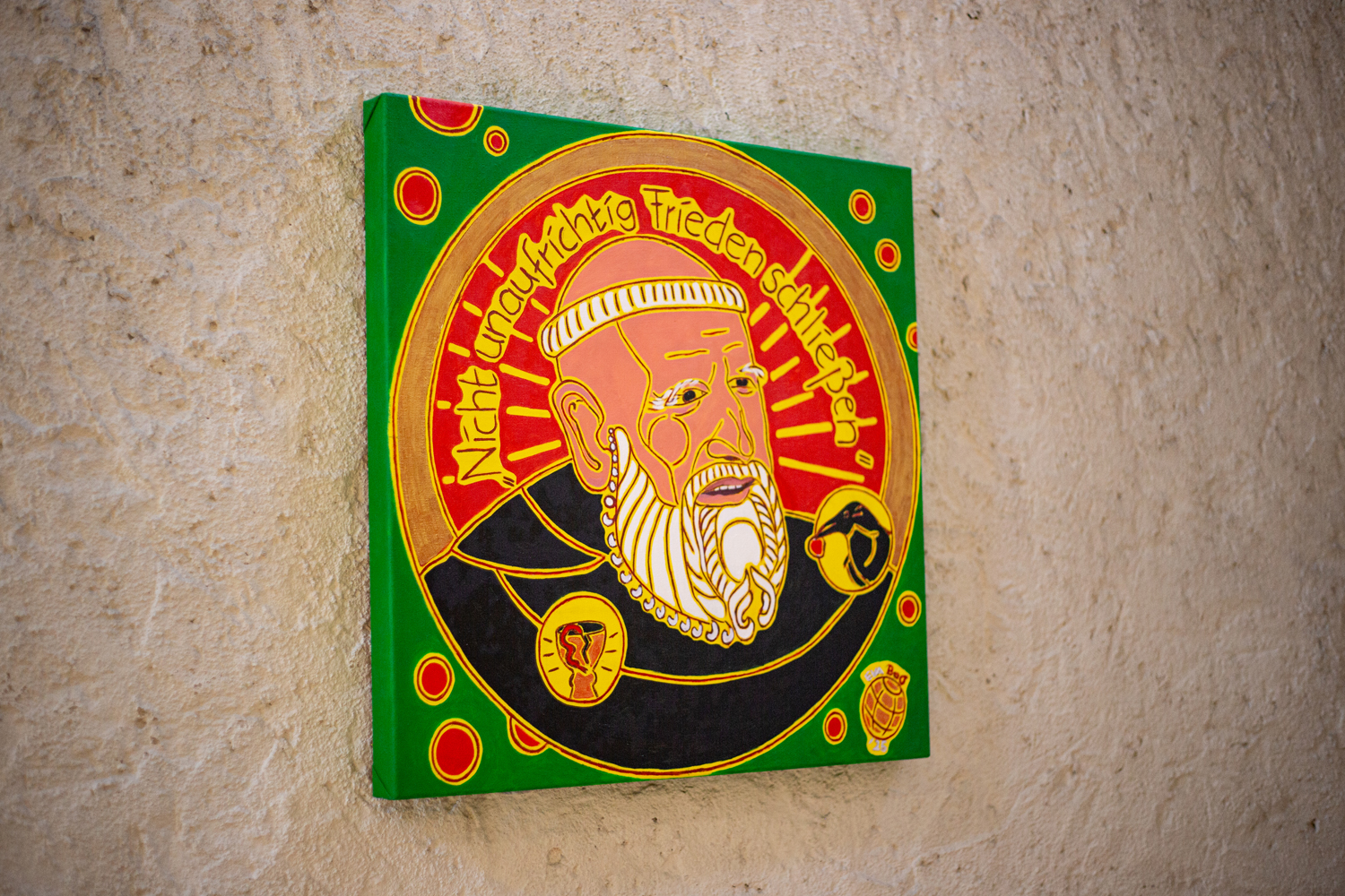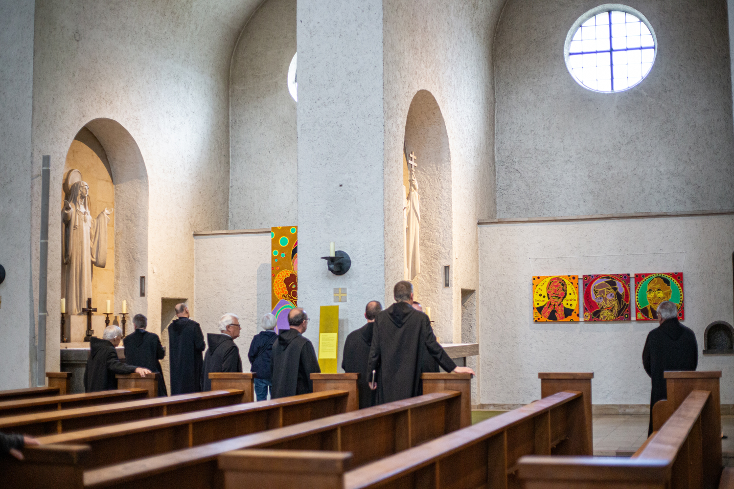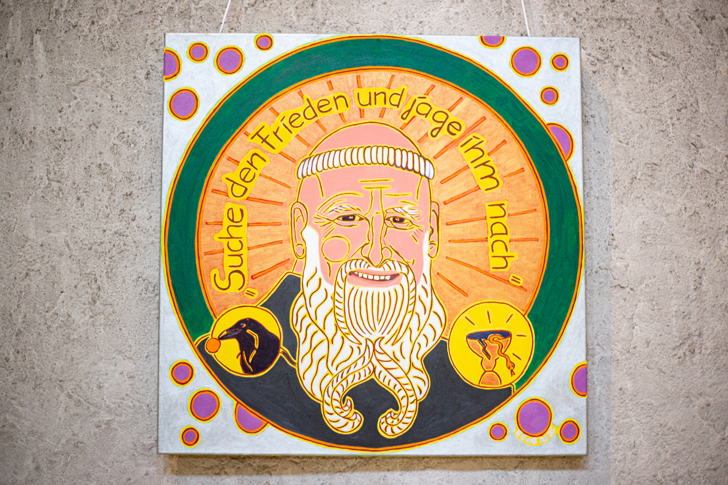 Ein weiteres Highlight war am späten Nachmittag mit der Ausstellungseröffnung von Künstlerin Eva Bur am Orde geboten. Unter dem Titel „PAX!“ zeigt sie farbenfrohe PopArt-Werke in der Abteikirche. Ihr Ansinnen: Dem Frieden ein Gesicht geben. Menschen, die mit ihrem Leben und Wirken auf außergewöhnliche Weise für den Frieden eingetreten sind, Männer und Frauen aus allen Religionen und Kulturen. Eine weitere Besonderheit: ein „Sanctus Benedictus“ – ein Porträt des Heiligen Benedikt anlässlich dieser Ausstellung als neues Element der Serie. Die Ausstellung ist über die Büchertage hinaus bis zum 22. Juni zu sehen.